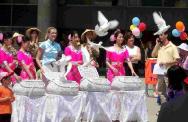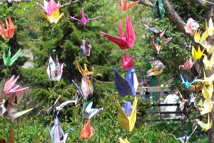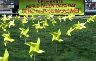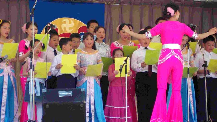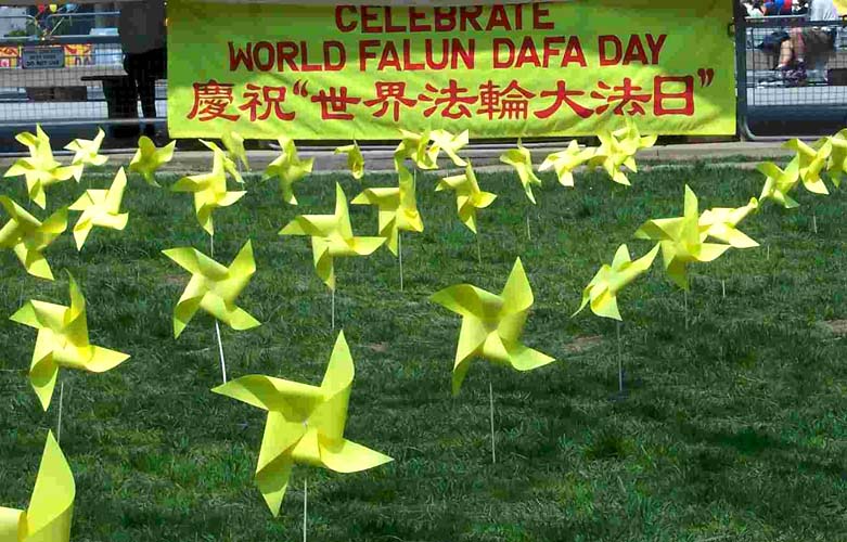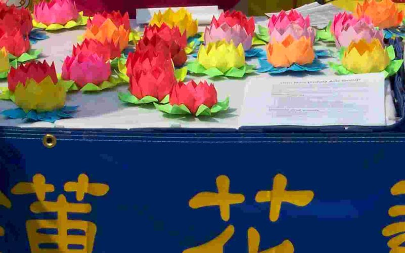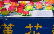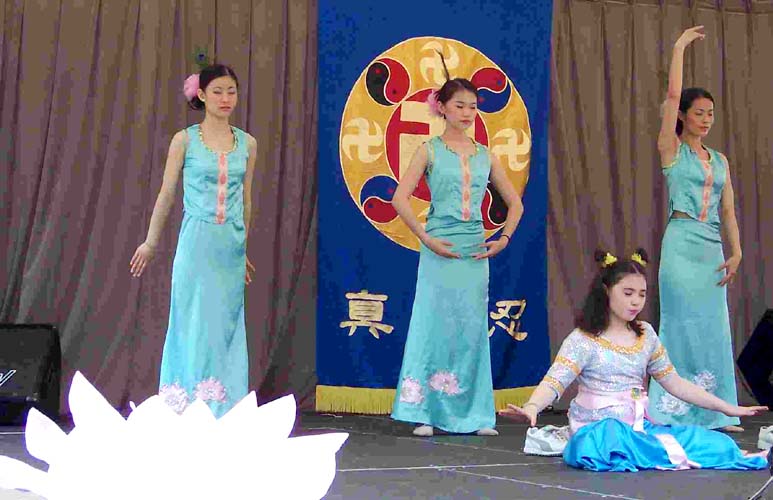 | 【明慧网2004年5月17日】作者:这是我第一次参加欢庆大法日庆祝活动,难以忘怀的神圣,慈悲,祥和。因而记录下这动人的时光和画面,思绪万千,在此与你重温,分享。 1 莲花,燕子,小风车, 这些大法弟子用心,用手, 用正念,用慈悲, 以纸塑成的造化, 如同一曲曲歌舞 触动着众生的心, 令人叹为观止。 Lotus, swallows and pinwheels these creations of paper, made by the Dafa disciples with their hearts, hands, righteous thoughts and compassion, are as touching and enlightening as the songs and dances performed. 2 飞吧,和平鸽, 带上这橄榄枝, 告诉那等待了千万年的世人: 大法洪传, 我们有救了! 飞吧,和平鸽, 把美好的祝愿, 带给从谎言中觉醒了的世人: 善待大法, 人类有福了! We are sending out the doves today, With the olive branches, Let those waiting for many millennia know, Because of Da Fa, We can be saved! We are sending out the doves today, Bringing the best wishes, To those awaked from the deceits: Supporting Da Fa, Mankind will be blessed!