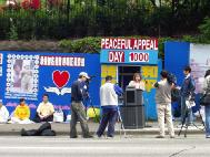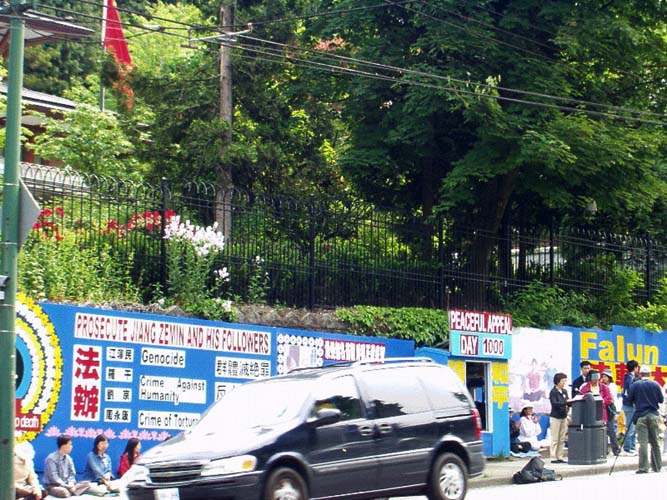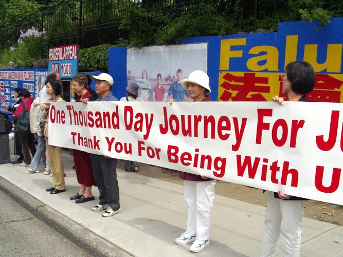 新闻发布称,2001年8月20日开始的已经1000天的和平请愿,不只是一个记录,她体现了法轮功学员坚持真理的勇气和反迫害的坚韧不拔的决心。 12年前,李洪志先生开始在中国传授法轮功。法轮功教人遵循“真、善、忍”的原则修心向善,五套功法简单易学,使人身心受益。短短几年的时间,凭着人传人、心传心,在中国就有上亿人修炼。 1999年7月,法轮功在中国遭到江氏集团诬陷,以莫须有的罪名被禁止,镇压行动步步升级,全国到处发生法轮功学员被拘留、被劳教、被监禁、被送精神病院,越来越多的法轮功学员因坚持信仰被迫害致死。 面对铺天盖地的谎言,面对血腥的灭绝迫害,法轮功学员没有屈服,没有暴力反抗,而是坚持不懈的讲真象,理智的清醒的和平抗争。温哥华学员24小时连续请愿也是全球法轮功学员反迫害、讲真象历程中的一部分。 1000个日日夜夜,在固兰湖大街(Granville St.)上留下了法轮功学员不屈的身影,陪伴着太阳升起,陪伴着黑夜来临。无论刮风下雨,无论大雪纷飞,他们从没间断。 他们的理性,他们的祥和,他们的韧劲,使越来越多的人了解了法轮功,了解了法轮功在中国受到的非人迫害。不论是巡逻的警察,附近的居民,还是路过的行人,学员身边的家人、朋友、同事、房东……,逐渐由反对、不理解而转变为支持、鼓励。大法熔炼了她的弟子,大法的力量感召着世人。 1000个日日夜夜,发生了多少感人的故事。一盆鲜花、一个苹果、一袋点心、一瓶水、一句关怀……,都使学员感到欣慰,因为那是世人的觉醒,因为那是美好的未来。 法轮功学员借新闻发布会的机会,向温哥华市民表示了诚挚的谢意。周围的居民、市政府官员、警察局……,他们在中领馆不断的骚扰、抱怨面前,选择了支持正义。“善有善报,恶有恶报”,这是宇宙的真理,历史一定会给他们满意的回报。 法轮功学员在发言中都表示,迫害一天不结束,他们在中领馆前的和平请愿就一天不会停止。