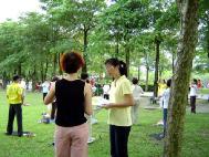 学员们通常利用周休二日的假期,在园区内炼功、发资料,向大家展示法轮大法「真、善、忍」的祥和美好。在罗东开设牙医诊所的陈姓医师表示,原本他常要靠药物来改善睡眠问题,学炼法轮功后失眠不药而愈,而且较会控制自己浮躁的个性。另一位医生学员李小姐也表示,从自身医学专业及亲身经验也证实法轮大法修心养性、祛病健身的功效卓著。她谈到法轮功在世界上得到一千两百多项褒奖,在台湾也受到从政府高层到社会各界的高度肯定。 来自五结乡的林小姐和她念小学的儿女修炼法轮功多年,她表示小朋友学炼之后都能以《转法轮》书中要求的提高心性勉励自己,敦品励学,在校成绩名列前茅,多次当选模范学生。一位曾姓学员有次洽公时,辗转听到乡公所一位职员对林小姐赞誉有加:她学炼法轮功后,做事总是考虑别人、为他人着想,孝顺公婆、勤俭持家,颇受邻里好评。 罗东当地一对退休的教师说,夫妻俩学炼法轮功后身强体健、无病一身轻,《转法轮》一书也解答了他们求道多年却不得其解的疑惑。他们觉得这么好的功法,己弘传世界60多国,使全球一亿多人身心健康,却仅仅因为学炼人数太多,五年来遭受大陆江氏集团诬蔑造谣、镇压迫害,秉于亲身受益匪浅,两人觉得应该让更多人知道真象,非常高兴能参加今天的活动。 一位游客向派发资料的学员表示,以前就想学法轮功只是不知向谁问,今天遇到学员可以一偿所愿很高兴。在立法院上班的学员李小姐告诉她:法轮功不收礼不收费,不涉及宗教和政治,要求修炼者提高道德水准,做个好人中的好人,目前全台湾有一千多个炼功点,可以就近学炼。 法轮功在台湾蓬勃发展,许多人因而身心受益。对照于一水之隔的大陆,坚持「真、善、忍」信仰的法轮功学员却遭到江氏集团严刑加身的残酷迫害,更多大陆同胞至今还受造谣媒体的欺骗,令人不胜感慨。「请给我一张简介!」又多一个人能明了法轮功真象了。在绿意盎然的运动公园,法轮功学员们演示五套柔和优美的功法,为午后的兰阳带来更祥和静谧的清新之美。