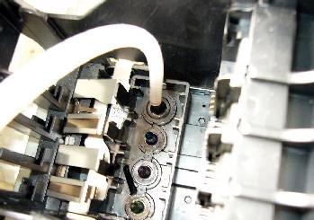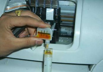 用简易清洗器吸入10ML纯净水插入吸墨柱中先抽出墨水后,然后缓慢打入纯净水:要反复一两次,如果以前使用时间长一定要多洗两次。查看一下以前清洗喷头的文章。(关于建小资料点中的相关建议有详述)  排墨管导出