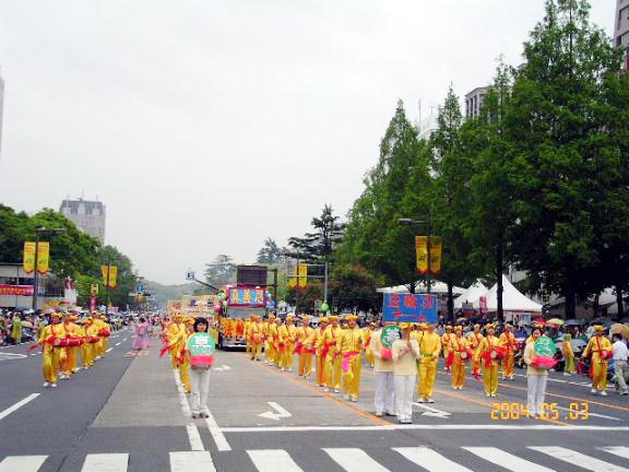 【明慧网2004年5月6日】五月的日本广岛到处鲜花,人潮。一年一度的五月花节,今年以“让花之轮、人之轮、和平的讯息越来越广”为主题,于2004年5月3日在此拉开序幕。花节以广岛和平大道和和平纪念公园为主会场,69个团体,大约6200人参加了首日的大道游行。下午虽然开始下雨并渐强,仍然有约35万观众热情不减,兴致勃勃观赏。为了让更多人看到法轮大法的美好,日本法轮功学员这次是第三次参加世界和平花节。