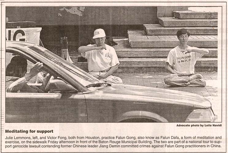 【明慧网2004年6月5日】5月28日下午,德州“支持诉江汽车之旅”抵达路易斯安那州首府巴特鲁日(Baton Rouge)。在市政大楼外的人行道上,学员们架起了横幅“紧急呼吁停止迫害法轮功”、“酷刑正在中国发生”,以及江氏恶警酷刑折磨法轮功学员的图片。三位学员演示了恶警酷刑折磨法轮功学员的情景,另有三位学员示范法轮功的功法,向过往行人分发真象资料,并回答他们的问题。 该市的主要英文报纸“倡导者报”(The Advocate)的两名记者得知消息后赶来采访,并于周末发表了题为“为寻求支持而打坐”的图片新闻报道。 倡导者报5月30日的图片报道说,星期五下午,来自休斯顿的朱丽-莱门斯(左)和维克多-冯在巴特鲁日市政大楼外炼法轮功,法轮功也叫法轮大法,是一种打坐和炼功的功法。他们正在参加一个跨美之旅,支持起诉中国前领导人江××,江被指控在中国对法轮功修炼者犯下了群体灭绝罪。