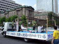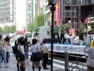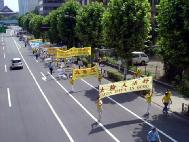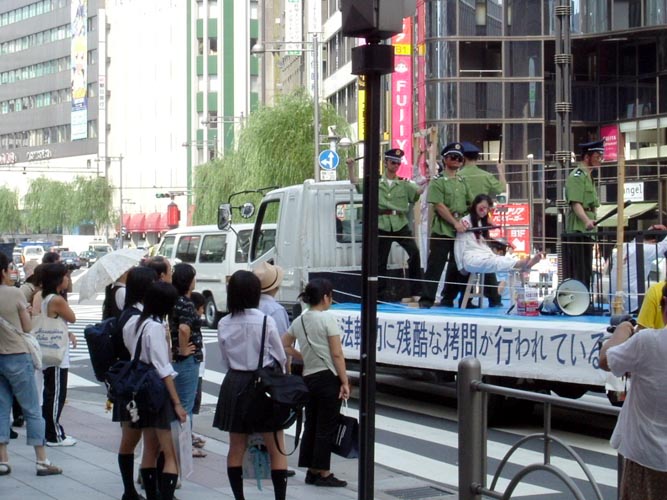 * 路人震惊于酷刑 2004年7月18日下午1时半,日本法轮功协会组织的主题为反酷刑的游行,从东京塔下的芝公园出发,历时2个小时,到秋叶原电子街附近的神田儿童公园。 游行队伍前导的4吨大卡车上,法轮功学员真人演示酷刑展,包括吊打,老虎凳和关铁笼子,卡车缓缓前行,“为你而来”,“请与我比邻而坐”等箫声在大街上流淌,同时高音喇叭不断的播音,告诉人们车上的酷刑演示正在中国每天真实发生着。来自日本各地的部分法轮功学员约200人,举着“法轮大法好”,“江泽民迫害法轮功天理难容”,“强烈谴责中国独裁者向海外输出国家恐怖主义”,“全球公审江泽民”等横幅和迫害图片跟随,沿途的两边人行道上法轮功学员不断向路人分发传单。 刚好是3个连休日中的东京,游行经由的东京车站,银座和秋叶原一带等繁华街区,人来人往,西银座百货商场前排长队购买彩票的人们,东京车站前等待长途客车的旅客……不少人主动索要传单阅读,人们神情凝重的观看,摇头叹息,震惊,询问,有的还跟着队伍不断拍照。 记者随机采访了几位路人,一对到日本旅游的瑞士老人吃惊地说,他们怎么能那样对待老百姓?太残忍了。 一位名叫铃木的先生告诉记者,他是警察,接着马上指着卡车解释说他是日本的警察,不是中国那样的坏警察。 记者问一位中年公司职员,看到这样的游行有何感想,他说对于在现代民主国家生活的日本人来讲,真是难以想象这样的拷问,同时对日本法轮功学员呼吁停止迫害的行动表示敬佩,对在烈日酷暑下演示酷刑的学员非常关心。 * 江鬼必定要被绳之以法 曾因在北京分发法轮功真象传单而被强行劳教1年半,在日本政府和社会各界的全力营救下回到丈夫和家人身边的金子容子,也和丈夫一起从新泻县的佐渡岛赶来参加游行。 她说,由于中国前国家主席江泽民个人对法轮功的妒嫉,发动的对法轮功的这场镇压已经持续了5年,而且仅知道详细情况的就有1009名法轮功学员被迫害致死,修炼法轮功的人就是希望得到健康的身体,按照真善忍作好人、更好的人,在中国就受到这样残酷的迫害,所以在中国没有人权、没有信仰自由,我本人就是这场迫害的见证者。 说到这里,金子声音哽咽了:我被非法劳教1年半期间,经历了各种酷刑的折磨,今天的酷刑展,我看到忍不住眼泪一下就流出来了,实际上对法轮功的迫害酷刑啊,已经超过100多种,这里展示的真是冰山之一角,好多比这还要残忍。这五年来世界各地的法轮功学员在坚持不懈的努力,现在很多国家政府、人民和国际组织,都在反对这种迫害,人们已经认识到这种迫害不仅是对法轮功的,对人权的迫害实际上是对所有人的迫害,我想这种迫害也不能再持续下去了。江泽民害死这么多条生命,中国人都知道欠债必还的道理,他必定要偿还、必定要被绳之以法,否则天理不容。 * 中国驻日大使馆谎言惑众 记者就中国驻日大使馆对法轮功的指责,询问北海道来的佐藤先生:“中国大使馆说你们拿着资金来参加活动,请问你这次来东京从哪里领到钱么?” 佐藤笑着说,“自己花钱来的。” “为什么从这么远的地方,花费自己的钱和时间,特意赶到东京来呢?” “要把法轮功的真象、真实告诉社会,我就是自己要从北海道来的。因为自己也在修炼,虽然才开始不到5个月,我也想来和法轮功学员大家交流,我是从互联网上学习《转法轮》的,法轮功的动作也是通过互联网上学的。这是我第一次参加这样的活动,这么多人聚集在一起,令人感动,大家全心全意的做自己希望做的事情,真是太好了。” 游行参加者雷书红女士说:“中国镇压法轮功5年了,我们游行就是要告诉更多的人这种迫害的残酷,所以我一大早5点钟就从山梨县出发赶往东京。我们什么活动都是自己出钱,没有人给我们出钱,所以这种谣言很可笑。” “他们说法轮功向东京都政府申请NPO(非营利组织)是一种政治行为,你怎么看呢?” “NPO是民间非盈利组织,法轮功之所以申请NPO,是因为中国对法轮功的诬陷性的宣传,影响了全世界的人,比如日本人得到中国官方新华社的污蔑报道消息很多,我们要让日本人民知道法轮功真正是什么,如果没有他们的欺骗宣传,法轮功也不需要去申请NPO了。”