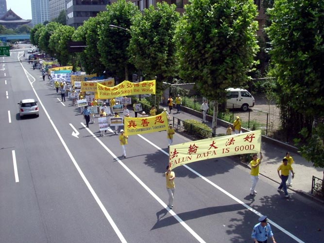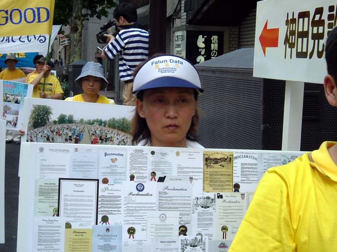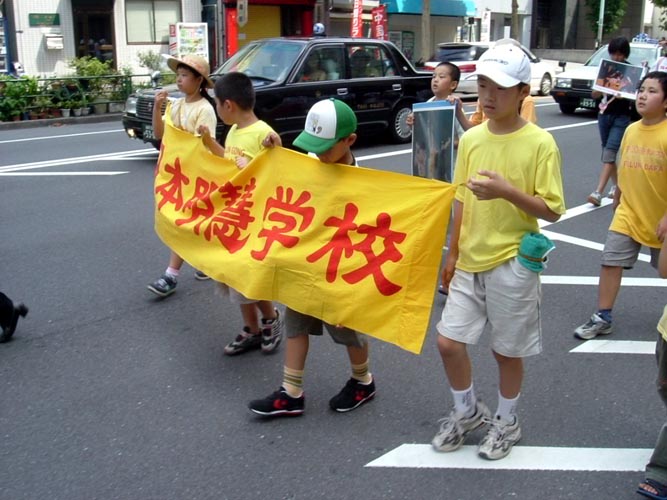【明慧网2004年7月22日】  金子容子在游行队伍中 |   酷刑演示 |   日本明慧学校学生参加游行 |