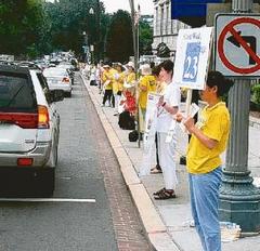 【明慧网2004年7月29日】世界日报7月28日报道,中国大陆[江氏]政府取缔法轮功已满五周年,来自全球各地的数千名法轮功学员上周齐聚华府,以群众活动呼吁全球继续向中国大陆政府施压。  法轮功学员举着标语,在华府市中心形成绵延三哩的“勇气长城”超过三千名法轮功学员23日在首府华盛顿的康乃狄克大道身着黄衫、手持“真善忍”及反迫害标语、图片,排成长达三哩的“勇气长城”,终点是中国驻美使馆前的天安门纪念公园。康乃狄克大道是首府出城要道之一,从市中心到杜邦圆环,一路吸引过往民众及驾驶人的注意。 数天的活动还包括林肯纪念堂前全球串连的中共[江集团]镇压法轮功酷刑大展、国会山庄前的游行与示威,高潮则是23日晚假林肯纪念堂前的“请你点一支蜡烛”夜悼活动。 在华盛顿国会大楼西草坪的和平示威活动上,学员一面炼功,一面听美国各界人士发表支持法轮功的演说。 主持这次示威游行的向东指出,这次集会是要向大众传布法轮功和平的精神和修炼的方式,同时呼吁国际支援来制止中国大陆[江氏]政府镇压法轮功。 假林肯纪念堂前举行的“请你点一支蜡烛”烛光夜悼活动由李進宁主持,他在细雨烛光中表示,点起蜡烛是为了悼念五年来坚持维护人间公理道义而被迫害致死的法轮功学员,也希望坚持“言论自由”者,无论身在何处也能点上一支烛光,唤起人们的道义良知。