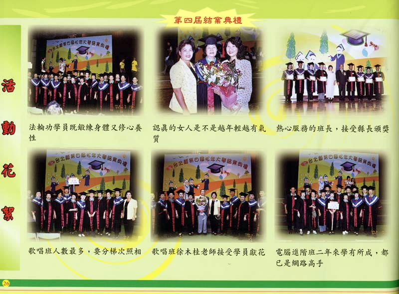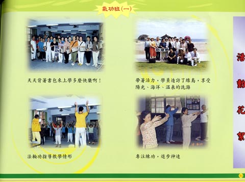 【明慧网2004年8月14日】台湾台北县政府提倡银发生涯规划,各地成立松年大学,在泰山乡的福泰分校,为老人开办各种课程如语文、舞蹈、歌唱、气功等。当地法轮功学员主动接洽主办单位,义务指导老人修炼法轮功功法,获得支持。一学年下来很多老人身心受益,结业时在纪念册上留下他们的修炼心得: 图片:台北松年大学结业纪念册部分内容林竹旺:我是退休老人,报名气功班,刚听到法轮大法这四个字,充满许多问号,很多热心的法轮功学员细心教导五套功法,在学习过程中,碰上动作不标准或是困难度较高的,我没有放弃,下决心好好学。我已年老力衰,一向有失眠和精神厌倦感,早上起来精神很不好,学了法轮功后,从此改善许多身体上的小毛病,对我身体有很大的帮助,学了法后我的心灵得到了清静。 姚陈阿妍:感谢一年来法轮功学员耐心的指导和鼓励,我接触了最善意的人们,让我感受到最真的感情,法轮大法让我获得平静,在生活中释怀一切争执,法轮功真是一种修身养性的好功法,学会了受益无穷。 庄林素琴:自从参加炼功后,原本走路不到5分钟就会脚痛的毛病渐渐改善,我现在已经可以走上20分钟的路没问题,而且全身舒畅,睡眠品质提高,这是我学习一年来的收获,愿以感恩的心分享我的喜悦。常听到一句话“活到老,学到老”,虽然松年大学是老人的课程,但我们在学习中把健康带回家中,让家人也感受到法轮功的美好。 潘信助:学气功已有一段时间了,但松年大学里教的法轮功,内容易学效果佳,很引发我的学习兴趣。刚炼习打坐有点辛苦,日常生活中都尽量盘腿,当时想单盘就这么难,何时才能双盘呢?天下无难事,只怕有心人,现在我已可以双盘了,而且越学越有兴趣,感恩法轮功学员用心指导和陪伴,让我们这群老学生有修炼的机缘。 王潘紫:自从到松年大学学炼法轮功后不再失眠了,精神状况良好,身体健康,回想刚开始学的时候,担心年纪太大学不会、学不好,常想打退堂鼓,但课堂中那么多热心的法轮功学员一直帮忙和鼓励,我也一直在慢慢进步中,现在反而常期待上课的时间快点来临呢! 黄林秋:法轮大法不但是炼功健身,也是一种修身养性的修炼方法,我学了以后,身体各方面都很好,腰酸背痛的毛病都好了,读了《转法轮》知道做人的道理,脾气个性由暴躁变得温和,做起事情来心平气和很顺利,心情很快乐,我们很珍惜能有这段修炼的时光。 杨静云:感谢推动松年大学法轮功课程的所有工作人员,这是一件最好的事,因为你们无私的奉献,让大家身心受益,真是功德无量,如果能继续推广法轮大法,不仅能助人祛病健身、净化心灵,提升道德,大家做一个好人中的好人,则社会将更祥和和少纷争,全民将更健康快乐。
