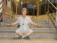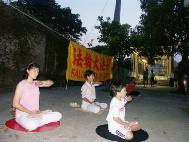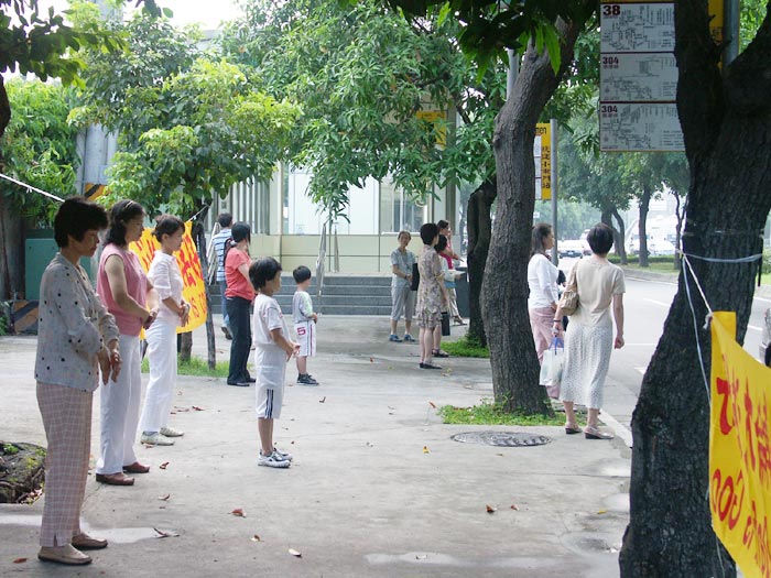 | 【明慧网2004年8月14日】一天我们在捷运站出口洪法炼功,一位阿嬷一看到我们炼功时的动作就跟着学,我们做叠扣小腹时,她也跟着叠扣小腹,我们做合十动作,她也合十。小弟子看到了这情景,就过去递上一份简介,阿嬷就很认真的看,不一会儿,就主动问学员有关功法的情形及哪儿可以学炼,学员们很耐心的说明,阿嬷很愉快的走了。 但过一会儿,再看到阿嬷时,令人惊奇的是,她竟坐在捷运站出口的阶梯上跟着我们学炼第五套静功,而专注祥和的神情,真令人感动。学员们看到此相片,也为阿嬷心中明了法轮大法的美好而为她高兴。   学炼第五套功法的阿嬷 |   在捷运出口的洪法炼功 |   在捷运出口的洪法炼功 |