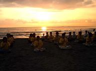 早晨于图书馆前炼功 |   于沙滩上发正念 |   本届法轮大法青年学子营留影 |