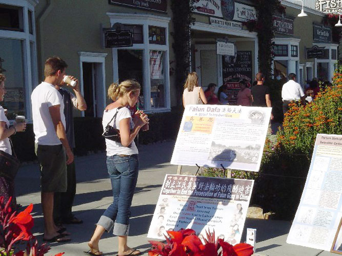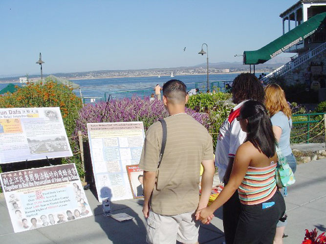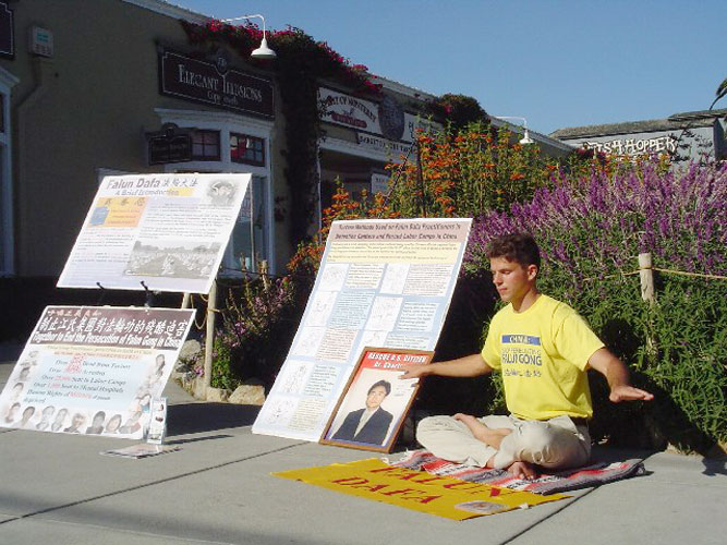 | 【明慧网2004年9月14日】9月11日这个周末,两名来自加州湾区的学员在蒙特利(Monterey)市一繁忙的路口進行了首次较大规模的讲真象活动。读了师父的新经文“放下人心 救度世人”后,我们认识到,对于象我们这样不能够去纽约讲真象的学员,要尽全力继续在当地讲真象,并且赶快行动起来在还没有涉足的周边城市讲真象的迫切性和需要。我们不愿落下一个人! 两名学员放置了讲真象展板和传单,并轮换着向行人做功法演示,讲真象。 一名女士特意走到一名学员面前诚挚的说:“谢谢你做的这一切。”另一名学员在做第五套功法时,一位墨西哥籍美国小男孩儿自己坐下来,和这名学员一起炼功。他的动作很准确! |