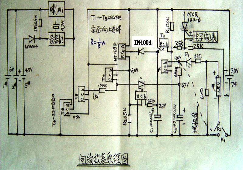电路图二、定时: ㈠电池定时: 拧上定时开关k2电线(延时约为11小时),后再合总开关K1,待11小时后响。(若情况有变,分开定时开关k2电线;改日挂时再拧上,延时=11小时-已拧上定时开关k2电线的时间) ㈡闹表定时: 此法较精确。把R1换成闹表组(见图示,停机1.6MA),去掉D1、30欧、62欧和1.5V电池、K2等,把K1用线连上,7.5V7号电池换成5号。明早闹铃时间开机。(闹表5元) ㈢光控定时(此法没有测试): 去掉D1~K2、K1.把R1改100K,把光敏电阻串接在R1上,按设定的光照强度调整光敏的阻值(可用纸包多层调整) ㈣电容C2延时:半小时后即响。 去掉D1~K2,小声合上K1即响(若不响是C2还存电,用T1管b极的虚线和K相触响后分开)后分开K1,调大声再合K1,使C2延时约半小时后响。若要延停1小时,把C2改成1000μ,即放音振荡为1:1。 三、电路振荡: 定时启动开机后,则: ①T1三极管关闭,T2开给C1充电,同时T3开,可控硅开,T4开,T4一路给C2充电,T1又开,T2关切断C1的充电和对可控硅的束缚,(目地使C1经T3放电1小时后,T3关闭,可控硅减小了通路而降至最小关闭电流而关机)。T4另一路去推动T5开,T6开喇叭响。T6集射压降0.2V左右。 ②C1放完电约1小时(开机),T3关整个停机。C2续流经T1放完电约需半小时(停机), T1关机,T2又开。这样周而复始的振荡到电源用完约12小时多 ③电路上是参考电压,开机总电流约9mA(T5为8MA),T6是350~500MA,停机总电流R1 50μA。 四、调试:(图中黑点处相焊接。) ①在盒外接出4根色差电线,先合K2,再合K1,用图示T1管基极虚线和K相触即响为正确,后分开K1断电。 ②在7.3V以上不停机细调大R2,使T3基极在0.6V左右停,调试时可安比例缩,如:33μ/2分钟,(电源应高于7.3V调整)。 ③若在7.3V以上放音时间短,一是R2调过大,二是新购的电容量不足数,应增大容量。 以上认真按图操作,把件腿刮干净涂上焊膏先焊上锡,焊接时瞬间加热不损件焊接不虚。 五、要点及注意: ①建议按图示位置做成网状电路附在喇叭外表用透明胶带封好,不易短路,便查看。②若要两倍放音2:1,可把C1、C2电容量增加一倍(放音时间是随7.5V电源下降而递减)。③T6管功率较大有热量单放散热处。④1号6V电池放喇叭盒内,2号5号7号绑盒外。⑤去掉原喊话器(喇叭)开关键板,留下功放板上的三根色线(“左红”正极,“中黑”负极,“右绿”音频),把电池仓盖板6V正极直接“左红”,把盖板负极(弹簧)黑线直接T6管的e极,T6的C极直接“中黑”。 录音机电池盒正极接15欧与二极管,盒负极接功放板“中黑”。音频:断开录音机小喇叭,耳机一点接4.7电容正极,电容负极接功放板“右绿”线上。 注意:切勿将喇叭音量开最大,免损件,中间为佳。 T6管1.5元,其它件共2元。