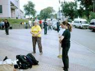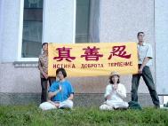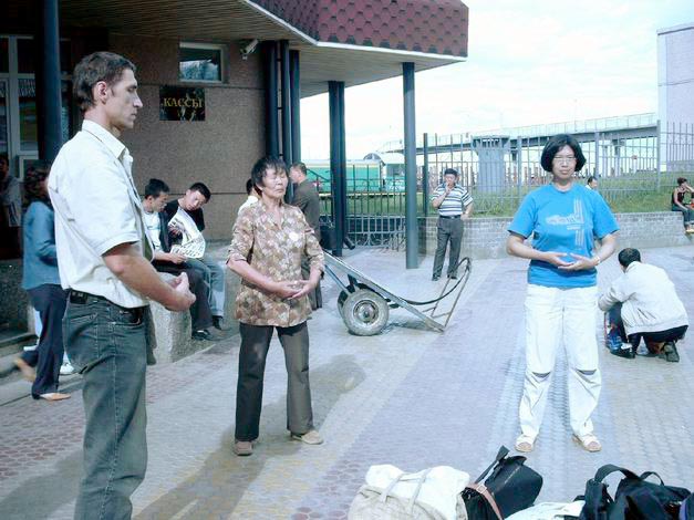 | 【明慧网2004年9月9日】 * 在戈城(grodekovo)火车站讲真象 在我们告别了路上遇到的有缘人后,由于时间关系,我们只好抓紧时间赶路,因为是星期日路上连个人都很少有,车辆更是见不到,只是偶尔路边农家里的狗见到我们一行人会叫一叫,正着急时候,恰好路边一辆停着的面包车正在发动,我们和车主商量后,面包车载着我们赶到了火车站。火车站前停了好多的旅游客车,一堆堆的都是中国旅游团。原来戈城的火车站和中国只是一步之隔,在火车站的另外一侧就是中国境内,透过栏杆我们看到那边停着的是中国的列车。正好我们回乌苏里斯科市的火车还没進站台,我们便把我们带去的中文真象资料派发给中国来的游客,开始他们都不接,我们便大声的向他们讲真象,好让更多的人听到,我们告诉他们:“92年大法洪传到99年迫害前有1亿人炼功,现在全世界60多国家法轮功都是合法的,人们都能够自由的炼功,“天安门自焚”是编导的闹剧,而在中国5年的迫害已经使1000多人被酷刑迫害致死,而他们仅仅是为了坚持自己对“真,善,忍”的信仰。炼法轮功使千千万万中国人不光得到了健康的身体,而且也给他们带来了道德的回升,而江××等人对法轮功的迫害,仅仅因为法轮功修炼者如此之多,已超过共产党员的人数,这是他们不允许的,所以才开始了对法轮功的镇压,请大家一定不要相信国内媒体对法轮功宣传的谎言,中国人经历过多次的政治运动,应该能明白受害的都是老百姓,而我们到现在5年来一直也是和平的告诉人民真实的情况,法轮功没有自焚,没有自杀,全世界的法轮功弟子都在讲真象,这些资料都是我们省吃俭用的钱印的,就为了中国人的良心,就为了说一句真话,请大家好好看看吧……” 慢慢的周围的人开始围着我们听,而后有几个人也拿了真象资料,但大多数只是看我们,有的人走近跟我们说,我们是政府团,你到别的地方去讲吧,那里还有好多中国人呢。我们不停的向他们每个人发资料,很多人还是不敢拿,而有人偷偷的靠近在大厅售票窗口买火车票的弟子,拿了资料和光盘后,悄悄的藏在包里。以前看到一些报道里说很多中国旅游团在出国前都上过“专门教育课”,不让他们接任何法轮功的真象资料,而且甚至每个团都有专人负责监督,没想到这些人真的这么害怕,连一份传单都不敢拿。我们想,哪怕不拿真象资料,我们也要让你们听到真象,清除他们因为5年来天天听国内媒体攻击大法而被毒害的思想,人听了真象如果能明白过来,也是一样的有机会得救,我们就一直不停的讲,其他弟子发正念支持。从他们的眼神可以感觉到他们其实都在等着真象,都期盼着我们多讲一些真象,从他们的反应我们意识到要不断的讲,更多的讲。这时一个弟子和在车站值班的警察讲真象后得到许可,允许我们在车站前的小广场炼功。我们几个弟子围成一圈开始炼功,随着炼功音乐的响起,周围的中国人都聚精会神的观望着我们,今天在中国法轮功发源地他们却看不到公开炼功的大法弟子,而在国外,仅仅是一步之隔的俄罗斯边境小城人们却可以自由的炼功,也许这个反差也可以引起他们的深思吧。  学员们在车站前的小广场炼功 |  学员们在车站前的小广场炼功 |