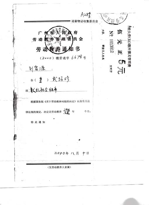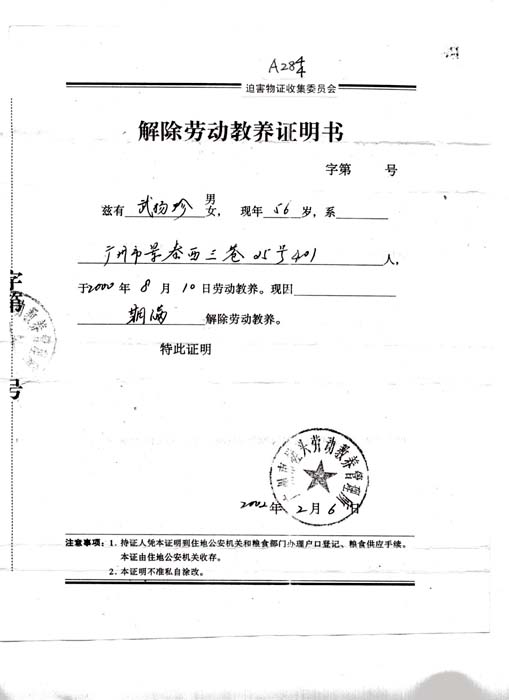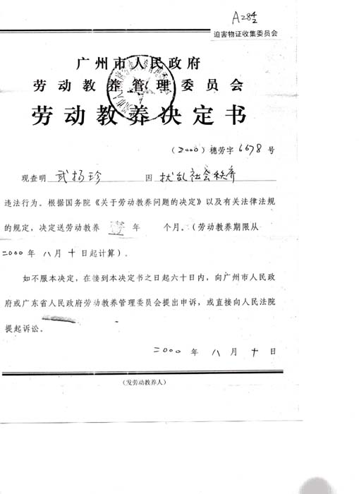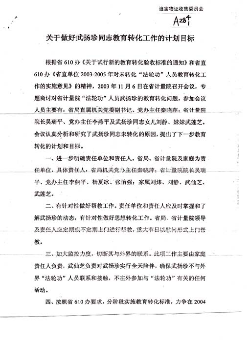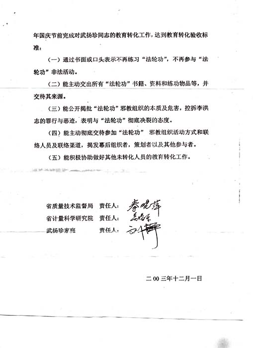 | 【明慧网2005年1月7日】(明慧评论员古安如撰稿)中共江氏集团在1999年6月10日成立了一个610办公室系统,专门对法轮功进行迫害。此系统遍布各级政府、遍布全国各地,用百姓的血汗钱迫害中国最善良的一群百姓。迫害的一个重要手段就是在各地举办大量劳民伤财的所谓的“转化班”,实为洗脑班,用来对法轮功学员进行劫持洗脑,以无所不用其极的手段强迫法轮功学员违心表态放弃对“真善忍”的信仰。 明慧网报道了大量各地“洗脑班”、劳教所等迫害法轮功学员的场所,为所谓“转化”法轮功学员而使用各种残暴、阴险、伪善和邪恶手段对待坚持信仰的法轮功学员;也有报道称,各地有从“上面”下达的“转化”指标,达标者升赏有加,不能达标者则被降职降薪、名利俱损,因此“转化”的成功率成为各地昏官狱吏、不法打手们追逐的目标。对于610恐怖组织如何统一判定完成“转化”、统计达标,明慧《物证收集委员会》手中来自中国大陆广东省广州市的文字物证,提供了610所规定的对法轮功学员的所谓“转化验收标准”。 * 610仍在试图强迫坚持信仰的法轮功学员违心妥协 这份文字物证,包括一份广州市政府劳教管理委员会对法轮功学员武扬珍的劳教决定书、一份劳教通知书、一份广州市槎头劳教所解教证明书,以及一份由省局直属机关党委、省计量科学研究院、武扬珍的家属三方面,在2003年12月1日签署的所谓“转化工作的计划目标”。 从这份文字物证可以证明,广东省计量科学研究院年过半百的法轮功学员武扬珍女士,因修炼法轮大法,在2000年8月10日被广州市政府劳教管理委员会以所谓“扰乱社会秩序”为名劳教一年,送进广州市槎头劳教所;在2002年2月6日超过劳教期限半年后,武扬珍女士才被解除劳教。 所谓“转化工作的计划目标”开篇即说明,是根据省610办《关于试行新的教育转化验收标准的通知》和省直属机关610办《省直单位2003-2005年对未转化‘法轮功’人员教育转化工作的实施意见》的精神,由三方责任人召开会议,“认真分析研究”了武扬珍“未转化的原因”后提出的。不言而喻,一年半的劳教,并没有改变武扬珍对“真善忍”的坚定信仰,被解除劳教后的一年零10个月里,无论面对什么样的洗脑、监视、压力和恐怖,她仍然没有改变修炼法轮大法的信念,武扬珍因此被视为“未转化”者,并被列入重点“转化”对象。 在610新验收标准的压力下,以省局、省计量院及家庭为“转化”责任单位,从省直属机关党委、党办主任,到计量院院长、党办主任,再到武扬珍的女儿和妹妹,都被胁迫参与 “转化”,不仅开会“专题商讨”对她的“转化”问题,而且成为具体实施和监视“转化”的“责任人”。 * 把迫害延伸到社会的最小单位——家庭 在由单位和亲属三方签署的所谓“计划目标”中,第三条详细制定了以家庭为单位的监控计划,明确规定“此项工作主要由家庭负责人负责”,武扬珍的妹妹被胁迫成为“全天候贴身”监控执行者,武扬珍的女儿则被胁迫成为实行家庭“转化”的“负责人”。610这种把所谓“转化”落实到家庭的邪恶做法,不仅胁迫更多无辜之人在不明真象中参与迫害,也因此无端制造家庭矛盾,用亲人整治亲人,破坏家庭和睦和亲情关系,把迫害延伸到社会的最小单位——家庭。 在1999年7. 20中共江集团迫害法轮功以前,无数家庭因为家庭成员修炼法轮大法而使整个家庭受益,夫妻关系和婆媳关系改善、家庭成员间关系和睦、家庭生活其乐融融的故事数不胜数。迫害发生以后,谎言欺骗、洗脑和灌输仇恨,迫害也延伸到了家庭。武扬珍的例子就是一个佐证,用女儿去“转化”母亲,用胞妹去“监控”姐姐,这就是610所倡导的家庭关系。在迫害中,中共江集团一直在制造谎言,欺骗世人,煽动对法轮功的仇恨,其中之一就是大肆散布所谓法轮功学员不讲亲情、不顾家庭的谎言。武扬珍的例子为我们提供了一个铁的事实,让人们看清,到底是谁在不讲亲情?到底是谁在破坏家庭?是谁造成了因为修炼“真善忍”而佛光普照、礼义圆明的家变成了软禁修炼人的监所?亲人变成了610的雇佣? * 严重侵犯人权的监控、封闭式“转化”方式 在这份“转化”工作计划中,规定了单位和家庭的“责任”:责任单位和责任人要“及时掌握了解”被“转化”人“动态”,甚至明确规定“省局、省计量院领导及责任人应定期或不定期上门”骚扰,“重大节日以慰问形式上门”骚扰;并且把家庭变成了软禁场所,把亲人变成了610便衣,24小时监控武扬珍,“切断其与外界的联系”,“实行全天陪伴”,“确保”使武扬珍绝对处于被严密监控的封闭状态,无法与法轮功学员正常联系和接触,无法行使任何宪法和法律规定的权利,丧失人身自由。 在各地的洗脑班和劳教所中,对法轮功学员有“包夹”制,利用打手或者犯人24小时“包夹”,强行隔离法轮功学员,监控法轮功学员的言行,制造孤独、恐怖、无助等等精神压力,以达到“转化”目的。对于解除劳教、在社会上工作生活的坚定修炼的法轮功学员,610便采用了单位和家庭的“包夹”制度,严密监控法轮功学员,胁迫更多的社会人员参与迫害。 * 610“转化验收标准”:“转化”就是“转坏” 该“转化”工作计划中坦言,对武扬珍的“转化”就是要达到省610办要求的“转化验收标准”。这五条“转化验收标准”彻头彻尾的表
