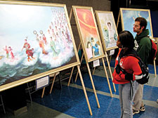 【明慧网2005年10月14日】(明慧记者王功成编译报导)美国密苏里州华盛顿大学国际特赦组织分部在滴水嘴画廊(Gargoyle)主办了为期一周的艺术展览。国际特赦分部的主席凯茨表示,展览是介绍法轮功的一种非常有效的方式。 大学生在欣赏作品华盛顿大学学生生活报10月12日报导,1999年,中共前总书记江××用国家媒体的诬蔑和警察的镇压为手段,发起了对法轮功的迫害。到今年为止,法轮大法信息中心报导有2747名学员死亡,数以万计学员被拘留,已有文件证实的中共警察迫害案件超过3万起。 报导说,展出的作品表现了法轮功的理念,还描绘了中共政府人员折磨、谋杀、监禁法轮功学员的真实景象。画展在圣路易斯将一直持续到十一月初。 圣路易斯华盛顿大学国际特赦组织分部的主席,二年级学生本杰·凯茨(Benji Katz)说:“我们认为展览是介绍法轮功的一种非常有效的方式”。 大学国际特赦组织分部的另外一名主席,三年级学生凯文·皮历施(Kevin Pirrish)说:“你看耶稣和佛,描述他们的方式是类似的,但这个展览绝不是宗教性质的,它是告诉人们有关人权迫害问题的。” 圣路易斯市的法轮功学员曾和大学国际特赦组织联络,商讨在滴水嘴画廊举办画展的事情。 在蒙三托(Monsanto)公司工作的蛋白质生化学家,法轮功学员田开荣(音译)多年前从中国移民到这里。她星期一参观了展览。 田开荣说:“现在我不能回中国,否则他们会把我关入监狱。他们监听我给父母和兄弟打去的电话,那里的公安人员和我父母谈话。我的丈夫不修炼,但是他支持我。当他回中国时,当局把他扣留,并和他说到我。” 星期二晚上,圣路易斯的中国移民李华桂(音译)在大学讲述了她1999年因修炼法轮功在劳教所被关押八个月的经历。被捕前,她是湖南省有30年教龄的高中数学老师。 李华桂说:“我很喜欢修炼给我带来的心情愉快的感觉,我的健康也改善了。警察试图给我灌输诽谤法轮功的东西。我开始绝食,一群男子就强行从我的鼻孔插管灌食。”