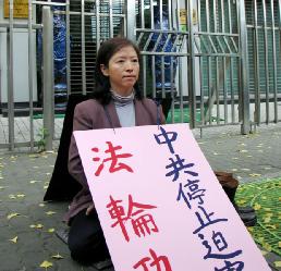 【明慧网2005年11月12日】中央社2005年11月11日报导,在亚太经济合作会议峰会开幕前夕,韩国舞台剧名伶徐甲淑今天下午在首尔市中共驻韩大使馆前,扛着“中共停止迫害法轮功”的标语板,呼吁中共终止迫害法轮功;接着她静坐抗议示威,并且穿越闹区走到中共驻韩领事馆,为中国法轮功修炼者请愿。  韩国名伶徐甲淑呼吁中共停止迫害法轮功 |