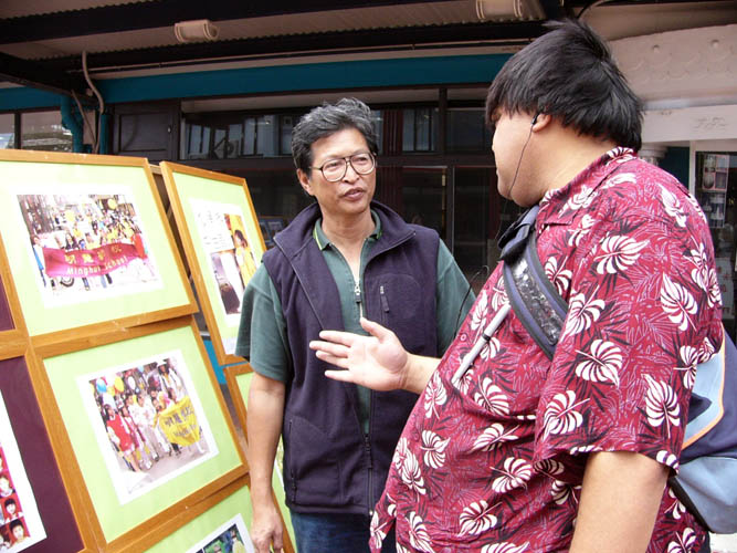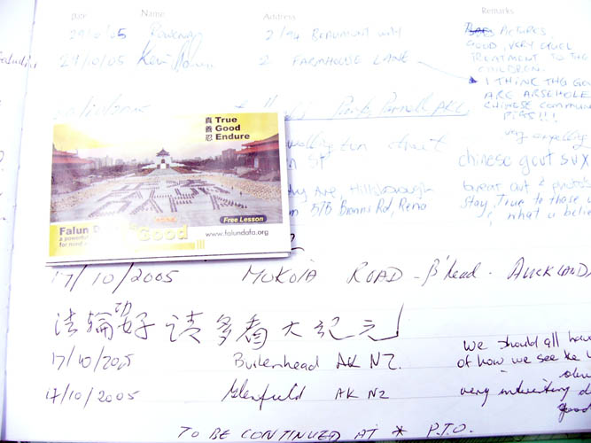 有一对华人老年夫妇,看过所有摄影图片后,还在“法轮大法好”的横幅前摄影留念。学员请他们坐下休息时,他们主动介绍自己是中国河南地区的人,已八、九十岁了。他们知道法轮功好。   老人在留言签名簿留下“法轮功好,请多看大纪元”的签字 |