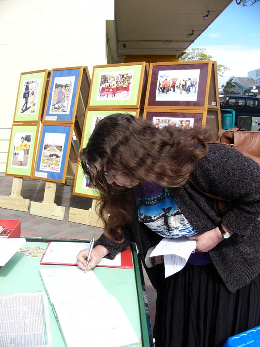 照片上的洋人女士听到法轮功学员讲述在中国大陆共产邪党耗费巨资迫害法轮功学员已6年了。她在留言签名簿中写下:这么残忍!为什么还要和中国共产党政府贸易啊!? * “共产党不信神是要下地狱的” 11月18日,摄影展来到了奥克兰西区的Handerson购物中心。   请你也在留言签名簿上签名 |