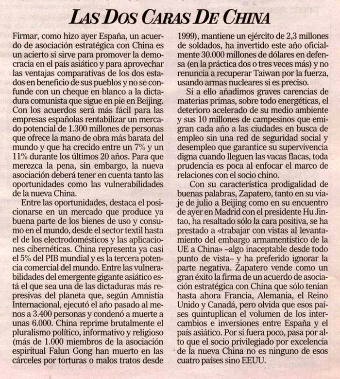 西班牙《世界报》(EL MUNDO)发表题为《双面中国》的评论员文章文章说,昨天西班牙同中国(中共)签署了战略伙伴关系,如果这样可以帮助这个伟大的亚洲国家步入民主体制的话那就最好了,但我们明白这又是一张北京共产独裁政权开给我们的空头支票。有了这个签约,西班牙公司可以更加容易的在这个拥有13亿人口的市场里投资。然而,如果我们想真正的受益于这个战略伙伴,我们就一定要认清这个双面中国,它的机遇和陷阱。 而关于这个隐藏的陷阱,诸位都很清楚中国这个亚洲巨人正在被全球最残暴的共产极权统治着。国际大赦组织指出去年在中国有至少3400人被处死刑,另6000 余人被判死刑。中共不能容忍在其统治下的任何其它党派以及信息自由和信仰自由等存在。 在中共执政期间,不间断的进行残酷的镇压,其中最严重的就是对法轮功精神团体的迫害。自从中共1999年开始禁止和迫害法轮功后,至今有至少1000名法轮功学员在监狱里被酷刑折磨致死。 在萨巴特罗总统的言语中,不论是今年7月访问北京还是昨天在马德里首相府接见胡锦涛时,他只提到了中共政权希望宣传的一面,并帮助中共向欧共体要求撤消武器禁运(这是从任何角度看都令人不可接受的),然而却回避或无视了更为重要的独裁中共的另一面。 |