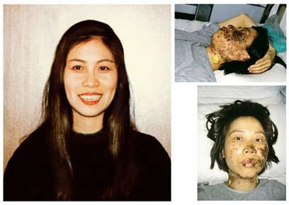 | 【明慧网2005年11月22日】这是一张极具震撼力和内涵深厚的组合照片。 被迫害致死的大法弟子高蓉蓉生前那端庄、清澈的相貌,和她被邪恶电击毁容后的照片组合起来,形成巨大的反差效果,迫害的血腥残酷、灭绝人性的程度昭然若揭:一位修炼法轮功的美丽姑娘,在中共迫害法轮功的罪恶中被夺走了生命! 这张组合起来的照片,把高蓉蓉的悲壮故事永远留给了人们。 高蓉蓉,辽宁省沈阳市鲁迅美术学院财务处会计师,坚持修炼法轮功,于2003年7月被不法人员劫持到龙山劳动教养院。在那里,她被恶警铐在暖气管上摧残折磨,被连续电击6-7个小时导致面部被严重毁容,肿大变形,满是水泡,烧焦的皮肤与头发脓血粘在一起,面目皆非,面部肿胀后眼睛只剩一条缝,嘴肿得很高变形,人们都认不出她来了。2004年8月9日高蓉蓉开始尿血、不能進食進水,瘦成一副浑身带伤的骨架,眼窝深陷,眼皮闭不上,人已经脱相。龙山教养院的上级主管部门沈阳市司法局拒不放人,声称死了也不让回家。 高蓉蓉被送到“医大”期间,多名法轮功学员在恶警严密监控下成功地将高蓉蓉营救,使她脱离魔窟。公安部将此定为“26号大案”,沈阳市安全局成立了“专案组”,沈阳市司法局曾发出抓捕高蓉蓉的“协查通报”。参与营救高蓉蓉的大法弟子多人被绑架。高蓉蓉不幸于2005年3月6日再次遭绑架,并于2005年6月16日被迫害致死,享年37岁。