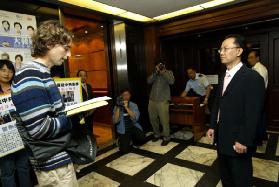 【明慧网2005年11月25日】2005年11月16日至19日,在胡锦涛访问韩国期间,中共有关当局向韩国政府施加压力,逼使韩国政府违背民主自由国家的原则,压制各地法轮功学员在当地的和平合法请愿活动,受害人包括香港往韩国参加请愿的11名学员,以及被非法抓捕并面临无理检控的当地学员。  法轮功学员在韩国驻香港总领事馆请愿 |