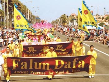 | 【明慧网2005年11月29日】1995年3月13日,李洪志先生赴法国巴黎传授功法,应邀在中国驻法使馆文化处举行讲法报告会。法轮功从此正式向海外洪传。 在1999年迫害之初,除了中国大陆之外,法轮功在海外主要在包括香港、澳门和台湾的亚洲地区以及北美、欧洲和澳洲等共30多个国家和地区洪传。而迫害進行六年之后,法轮功已经传遍了亚太地区、北美、南美、欧洲绝大部份地区,以及非洲的部份国家。据不完全统计,法轮大法至今已传至世界近80个国家和地区。 有法轮功的地方,就有法轮功学员讲真象的队伍,有法轮功学员的地方,就有法轮大法高高飘扬的旗帜。 这就是大法弟子的游行队伍,红红火火、光辉灿烂、浩浩荡荡的从人群中走过,法轮大法的旗帜处处飘扬,把真、善、忍的种子播向人间。 这幅盛大场面的镜头,从主题意义和形式上是很统一的,给人的印象是火热、隆重的气氛。画面充实与内容很和谐。