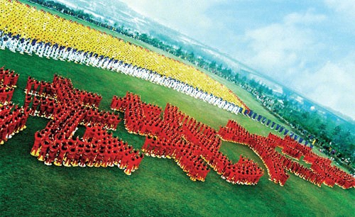 【明慧网2005年11月8日】这幅作品是中国大陆大法弟子在1999年7.20以前炼功组字形成的巨大字体“法轮大法”,充分表现了法轮大法自1992年洪传后的迅速发展壮大。