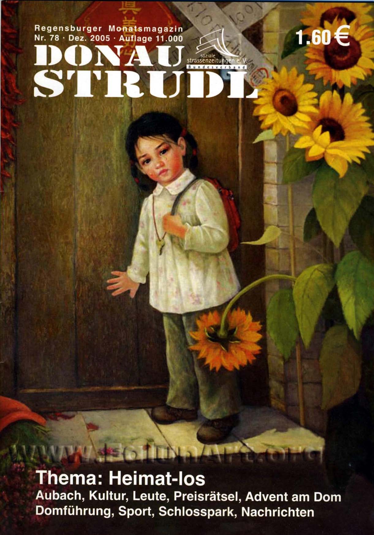 | 【明慧网2005年12月15日】德国雷根斯堡市12月期刊的《多瑙河浪》杂志主题为《无家可归》。主编采用了法轮功学员为真善忍美展创作的画作《无家可归》,表达了对因遭受迫害而无家可归的法轮功学员及他们的亲人的同情和关注。德国《多瑙河浪》杂志以《无家可归》画作为封面 《多瑙河浪》杂志对该封面画作进行了详细解说,并提及该画作曾于今年9月在雷根斯堡附近的卡姆城市政厅举办的“真善忍国际美展”上展出过。 11月初该画作也曾刊登在卡姆市的免费周报上。当时胡锦涛即将访问德国。周报刊登了法轮功学员的呼吁,法轮功学员要求中共停止人权迫害,尤其是对和平理性的法轮功学员的迫害,并呼吁德国总统向胡锦涛提出人权问题。