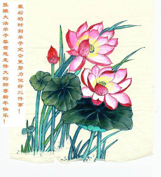 2006年新年之际,河北三河市大法弟子从心底道一声:师父您辛苦了!弟子想念您! 师父慈悲救大穹, 法徒助师世间行, 学法修心发正念, 讲清真相救众生。 正法洪势快又猛, 旧势系统灭无踪, 赤龙支离又破碎, 恶党胆战心也惊。 神助法徒推·九·评*, 退!党!浪潮风云涌, 越到最后越精進, 救度众生步不停。 江城子 法正乾坤十六载,冬未尽,又至春。千言万语,无句话师恩。劳心操尽穹宇事,主佛鬓,也添霜。 佳节回首修炼路,徒众苦,师尽尝。洪恩难诉,惟有字数行。神州处处遍金莲,千百万,盼师还。 大连大法弟子恭祝师尊新年好!