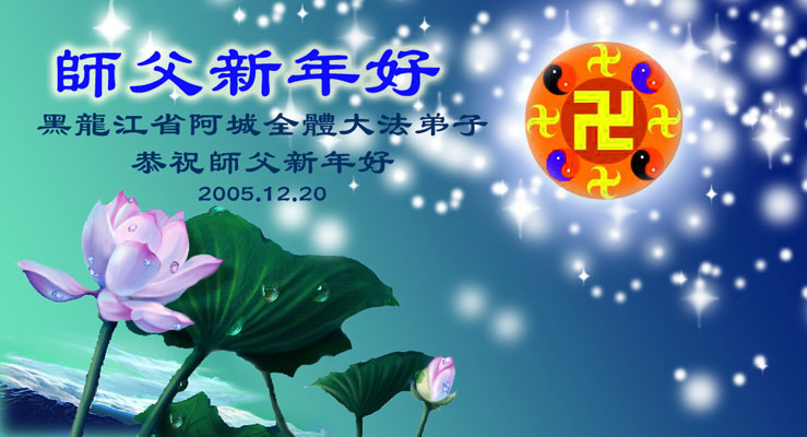 祝师父节日快乐!弟子们在新的一年一定会做的更好,尽最大努力做好三件事,请师父放心。 烟台市全体大法弟子2005年12月20日 哈尔滨弟子恭祝师父新年好!