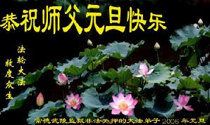 辽宁省丹东市全体大法弟子在2006年元旦来临之际向慈悲伟大的师尊问好:请师父放心,丹东大法弟子一定能够越来越成熟,并坚定做好正法时期的大法弟子,做好三件事,时刻正念正行,不放松对自己的要求,永不懈怠,圆满随师还。 2005年12月15日 淄博市博山区的全体大法弟子新年向师父问好!