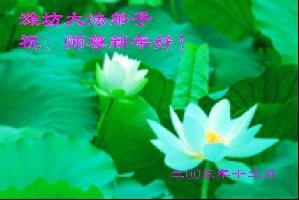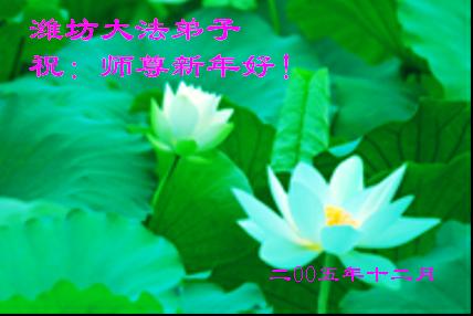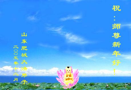 师父: 您好!在新年来临之际,祝师尊新年快乐!师尊为众生操劳,人间岁月又是一年,我们无从知道师父为众生付出多少心血承受多少苦难!但是我们知道无量的宇宙和无量的众生已有了无限美好的未来! 师父的无量慈悲和无量智慧,弟子敬仰之余,向师尊道一声:师尊,您辛苦了! 弟子代表全家向师尊问好! 德州大法弟子 2005年12月24日星期六 莱州大法弟子向慈悲伟大的师父问候新年快乐!