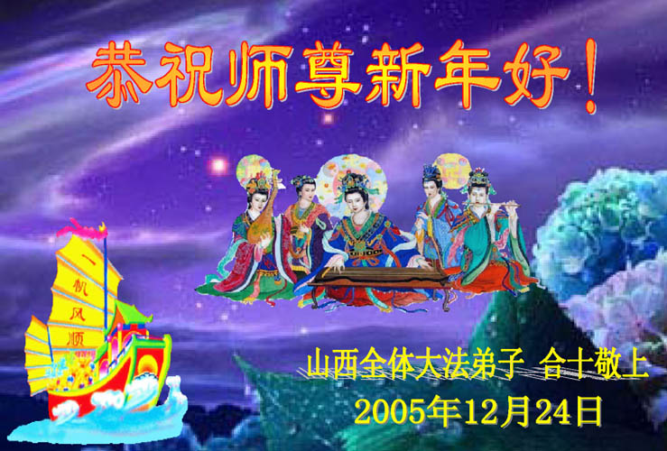 感谢师尊的慈悲苦度,我们要继续认真学法,正念正行,反对迫害,讲清真相,救度众生,走好证实大法的路。 山西全体大法弟子 合十敬上 2005年12月24日 河北三河市大法弟子遥祝师尊新年好!