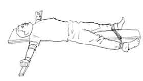 | 【明慧网2005年12月5日】99年7.20后,中国的看守所、劳教所、劳改场成为中共实施国家恐怖主义、残酷迫害法轮功学员的主要场所。在那里,江氏集团以国家和政府的名义进行血腥镇压,用公检法、武警等等专政和职业杀人机器有组织、有计划地对法轮功学员进行无法无天的迫害和虐杀,手段无所不用其极,使用的酷刑不下几十种。 一、种种酷刑: 毒打:恶警、犯人将法轮功学员手脚铐着拧、扭、勒、铁链悬吊拷打,逼坐钉板,铁棍、木棒狠打,不许睡觉,两手绑在大沙包上,然后拳打脚踢,用布蒙住头暴打,抓住头发猛撞墙,狠踢学员阴部,恶徒还用高音喇叭掩盖惨叫声。在疯狂暴打中,有的法轮功学员被毒打致死,有的学员内脏被打裂,吐血不止,有的多次昏死过去,有的头部被打破,耳朵被打聋,外耳被打掉,眼睛被打瞎,牙齿被打掉,骨头被打断、截肢、残废的。广州大学年轻教师、法轮功学员李小晶,2002年6月27日晚上被强行绑架进广州黄埔戒毒所洗脑班,于次日被毒打折磨致死。 电刑:电刑是恶警对法轮功学员对实施的最常见的酷刑之一。恶警用几万伏电棍电学员的口腔、头顶、前胸、阴部、乳房、臀部、肛门、大腿、脚底,有的用多根电棍同时电,有的长时间电击一个部位,直至烧焦烧糊,血腥味与肉糊味到处能闻到。电击发出蓝光,伴随着刺耳的啪啪声。电在人身上就像火烧一样,又像被蛇咬一样的痛。被电过的皮肤会变紫黑、红肿、溃烂,流脓等。 2001年广东潮州市法轮功学员洪浩远在三水劳教所被恶警用几万伏电压的电棍二至三根每天电击肛门十小时以上,用长条板凳毒打致身体内脏严重破裂,不治而逝的。 十字架酷刑:恶警将法轮功学员长时间捆绑成十字架形状或固定在十字架上,悬空竖立,无法动弹,四肢抻开至极限,双手吊铐在床头的横杆或侧面的竖柱上,脚捆绑在床尾两侧竖柱上,长时间被施以这种酷刑,手脖子被铐进肉里很深,身体僵直失去知觉。更残酷的是不许受刑者睡觉,一闭眼就暴打或施以电刑。大小便都在上面,有的还不给吃喝,并将受刑者放到烈日下曝晒。 在珠海市第一、第二看守所,恶警王映等对法轮功学员动用十字架酷刑。其中周梅林被用刑70多个小时,被解下来的时候,人已经不能动肾功能和胃肠功能严重衰竭,双手手臂被严重勒伤,后背和臀部已经生出多处褥疮。