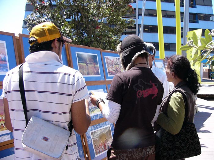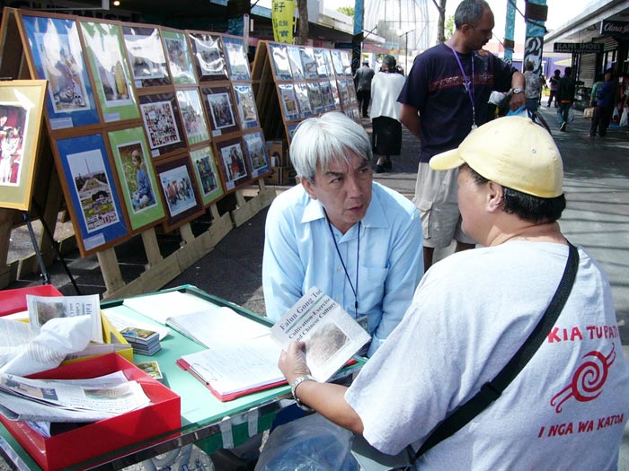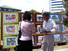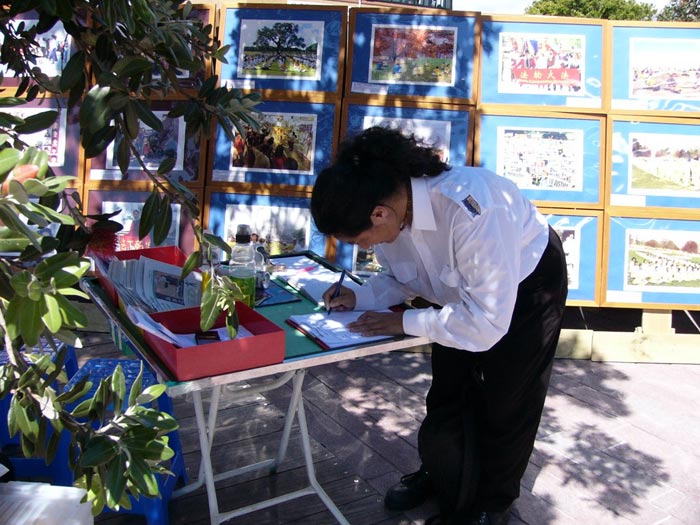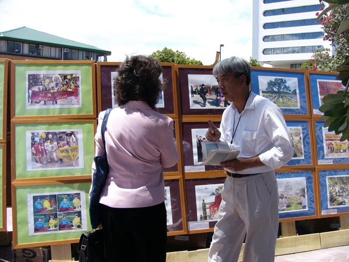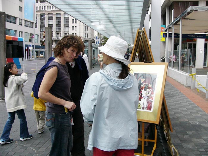 | 【明慧网2005年12月5日】2005年11月30日,法轮大法弟子证实法摄影展在新西兰奥克兰MANUKAU区的政府大楼前面的广场开展。中午休息时间不少的政府官员前来观看,有的留言说:政府应给人们信仰法轮大法“真、善、忍”的自由!还有的留言说:停止共产主义! 一位中国旅游团的全陪领队看了摄影展后说,他都看不过眼××党,国内的人心里都有数,××党不好、它的官腐败。他还说:有认识的人在中国公安搞网络监视工作的,都睁只眼闭只眼,因心里明白,要给自己留条路,积点德。他还告诉他带来旅游的国内官员,你想要的资料你就拿,一定能拿回去的。 一位毛利妇女看到证实法摄影展图片上显现的大大小小的法轮图形时惊叹的说太美了,马上把两个孩子从车上叫下来一起听学员讲法轮大法真象。她告诉学员:今天是一种无形的力量,要她来到这里,看到了这么美好的摄影展。 还有一位戴黄帽子的毛利妇女听了学员讲解高蓉蓉因修炼法轮大法被中共恶党政府迫害致死,并看到被迫害致死法轮功学员们留下的孤儿照片时,一边听一边感叹说“太邪恶了!太邪恶了!不能再有了。”她不但自己签字声援营救法轮功孤儿们,还把女儿的名字也签上,还向学员要了签名表说要帮助征签声援营救法轮功孤儿们。 2005年12月2日,学员们在新西兰奥克兰CITY海边的王子码头附近举行了证实法摄影展,遇到两位推销果汁饮料的年轻人,送来了他们的免费果汁饮料,要学员试饮。学员同时递给他们大法真象资料,告诉他们法轮大法好!两位年轻人完成工作临走时又专门留下几杯免费果汁饮料,送来给学员,并说谢谢你们!   王子码头附近举行证实法摄影展现场 |