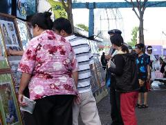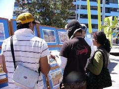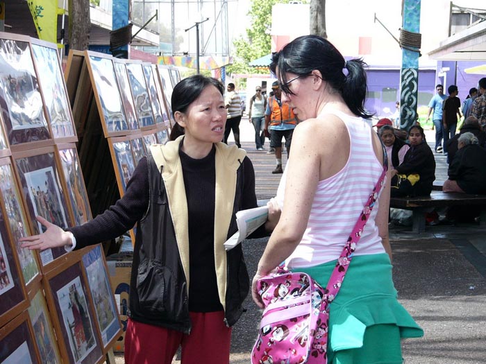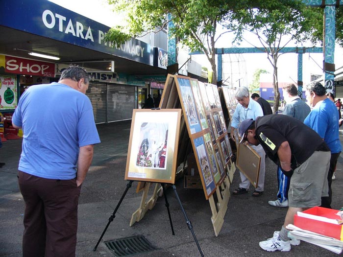 2005年12月3日,法轮大法弟子证实法摄影展到了新西兰奥克兰东区的OTARA商业中心。   摄影展现场还未布置好人们已在观看了 |   今天来参观的民众真不少 |