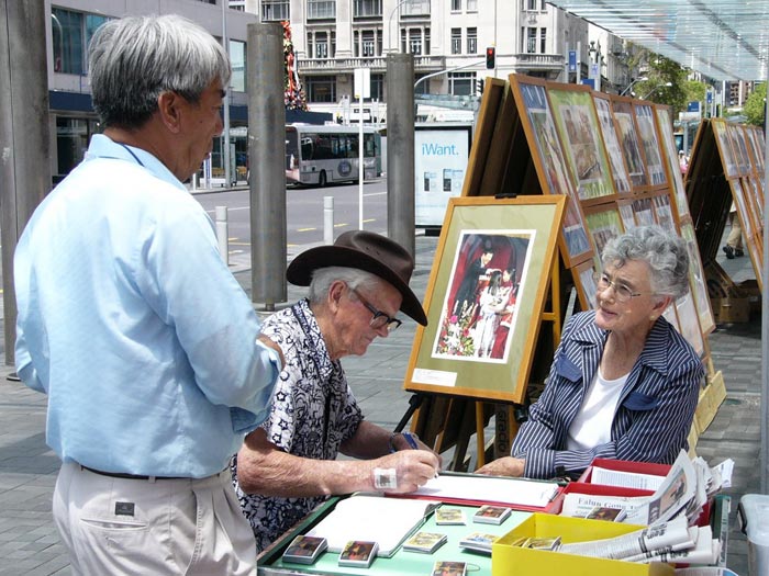 法轮功学员在告诉这位西人女青年:你知道吗?照片上的孩子们,他们的父母炼法轮功信仰真善忍,被中共恶党政府迫害致死,使他们成了孤儿。明白真象的洋人女青年马上就签字声援营救孤儿们。 2005年12月4日法轮大法弟子证实法摄影展到了新西兰奥克兰CITY的QUEEN街。两位女青年是从英国来奥克兰旅游的,其中一位说她曾在中国西安工作了6个月,照顾失去父母的孤儿。通过学员讲清真象,她们接下真象资料、签字声援营救受迫害法轮功儿童,表示要通过互联网和告诉佛教徒、基督教徒,把中国还在继续迫害法轮功学员,制造惨案的事实传播出去。让更多的世人知道中共恶党政府迫害法轮功学员的事实,声援早日停止迫害。   两位英国女青年表示要传播真象 |   老夫妇留言:“呼唤自由!啊,太残忍了!停止迫害!” |