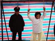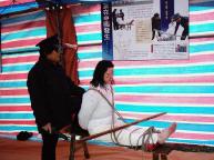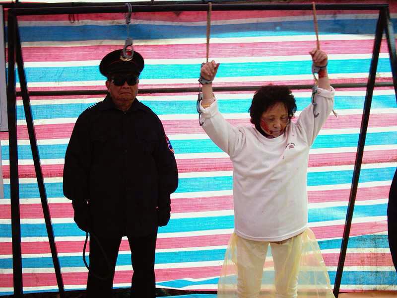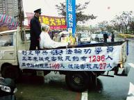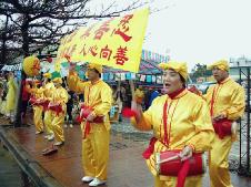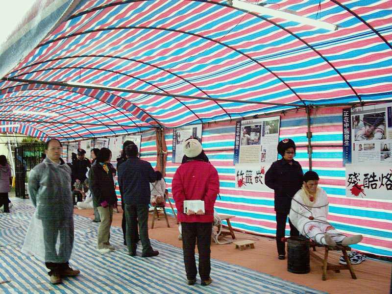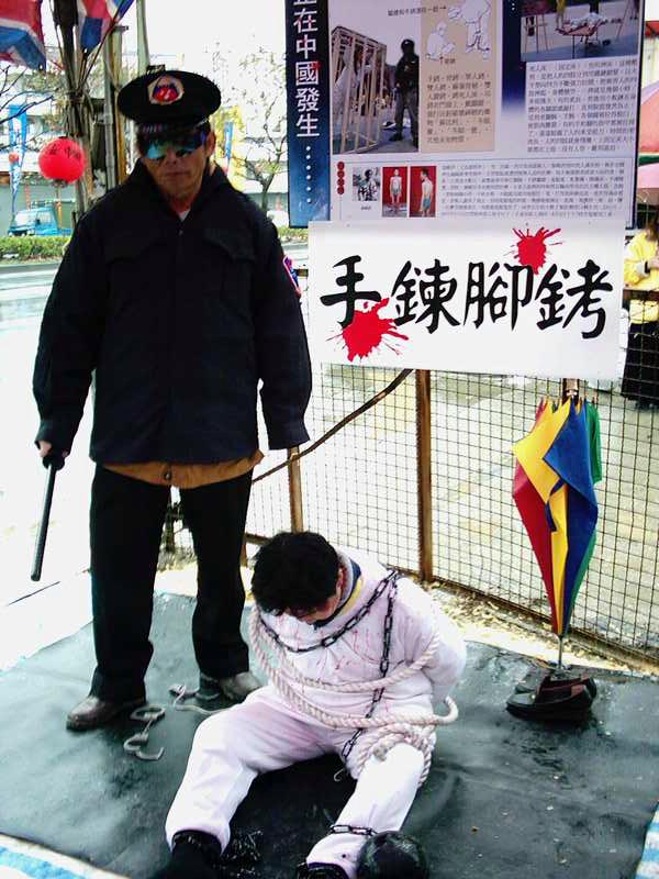| 【明慧网2005年2月25日】五花八门的各式灯笼中,有一种特别的灯笼,吸引了很多民众主动来索取,并且还帮亲朋好友多要了几个,那就是写着“法轮大法好”的灯笼。而上面有着“世界需要真善忍”的气球及莲花书签吊饰,也同样受到广大民众的欢迎。这是在台湾台中县丰原市元宵灯会中奇特的景象。 更奇特的是,从台中县市、彰化、南投、云林等等各地来的法轮功学员,不畏摄氏10度以下的寒风骤雨,齐聚一堂学法、炼功、洪法、讲真象、办“反酷刑展”,揭露了中共江氏集团为迫使法轮功学员放弃对“真善忍”的信仰而采取的种种酷刑:捆刑、竹签插指、手镣脚铐、吊刑、坐老虎凳、强迫灌食、电棍电击、罚做超时奴工……其实这些只是冰山一角,比起法轮功学员在大陆所遭受的肉体及精神上的折磨,还不及万分之一! 酷刑展示 功法演示 |  腰鼓表演 | 图片和反酷刑展帮助人们了解法轮功真象有些民众瞪大了眼睛,简直不敢相信21世纪的今天,竟然还有这种惨无人道的事情发生,而且是发生在同文同种的中国大陆!人皆有恻隐之心,人皆有父母儿女,为何中共下得了如此毒手?酷刑折磨这些手无寸铁的善良老百姓?共产党太恐怖了,这样的政府让人太无法理解了! 在善良民众的目光中,充满了同情和感慨。他们纷纷签下他们真诚的呼吁:支持人权!停止迫害!让法轮功学员回家去,拥有信仰的自由,拥有他们应有的权利,跟大家一样能元宵庆团圆。 不同于中国大陆的是,法轮功在世界60几个国家洪传,受到各国政府的肯定及民众的欢迎。灯会期间,法轮功学员也表演了腰鼓、舞蹈及法轮功学员创作的音乐演唱,展现法轮大法的美好,为元宵佳节增添了几许欢乐气氛。希望明年的元宵节,不再有迫害,人民有修炼的自由,大陆民众能摆脱暴力和谎言的毒害,这就是法轮功学员真诚的心愿。