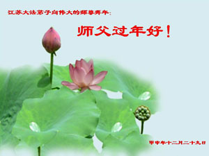 在2005年新春佳节来临之际,河南省周口市全体大法弟子以最崇高、最诚挚的敬意双手合十,向伟大的师尊拜年!祝师父新春快乐!祝师父全家新春快乐! 我们周口市大法弟子沐浴着师父的浩荡佛恩,在正法之路上,在坎坷中逐渐成熟,在教训中更加清醒,在否定旧势力安排中更加理智,在救度众生中更加坚定。大法弟子、新老学员,从九十多岁高龄的老人到十几岁的学生,从国家机关处级干部到普普通通的市民、村民都在主动做着大法弟子应该做的事情,同时又形成了一个协调配合的整体,使周口的邪恶越来越收敛,使越来越多的民众明白了真象,使周口的环境越来越宽松。一批批新学员走上了修炼之路,一些乡村的炼功点已基本上可以公开集体学法,正法進程急速向前推進。因此我们更加坚信师父,更加坚信法轮大法的无边法力。同时,我们也越来越感到时间的紧迫,肩负责任的重大。与师父的要求,与大法的标准对照,我们做得还远远不够,还有很多差距和漏洞。但是我们坚信有师在,有法在,我们一定能弥补损失,越做越好!请师父放心,我们一定珍惜法正人间之前的分分秒秒,归正自己的一思一念,更加扎扎实实的做好三件事,决心跟上整体正法進程。 江苏大法弟子给师父拜年