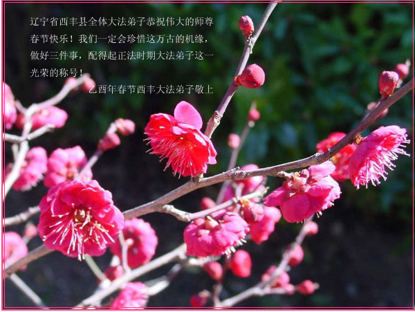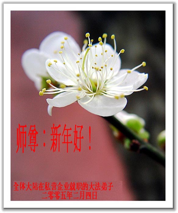 伟大神圣的师尊:您好! 浓浓的年味,和着梅的芳香,伴随着鸡年的喜庆,悄悄的飘来了,走近了。在这万众欢腾合家团聚的节日里,我们和神州大地上无数的大法弟子一样更加思念您。正是您无量的慈悲、无穷的智慧把无数善良的生命逐步带到了一个美妙崭新的境界! “谁言寸草心,报得三春晖。”您对世间的恩德不是一个小小的“晖”字所能表达的,但人类的语言仅此而已。 师尊!敬祝您新年愉快! 山东兖州新得法大法弟子 2005年2月1日 河北省张家口市宣化区大法弟子恭祝伟大的师尊新年好!