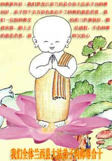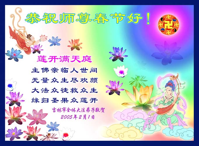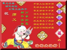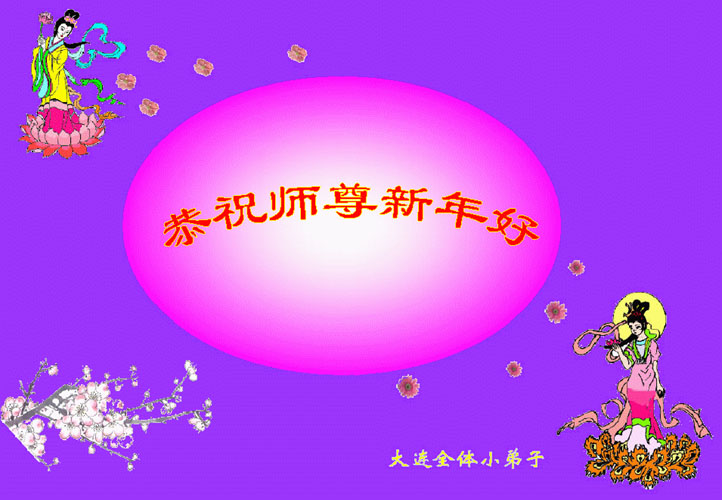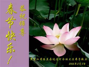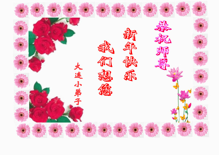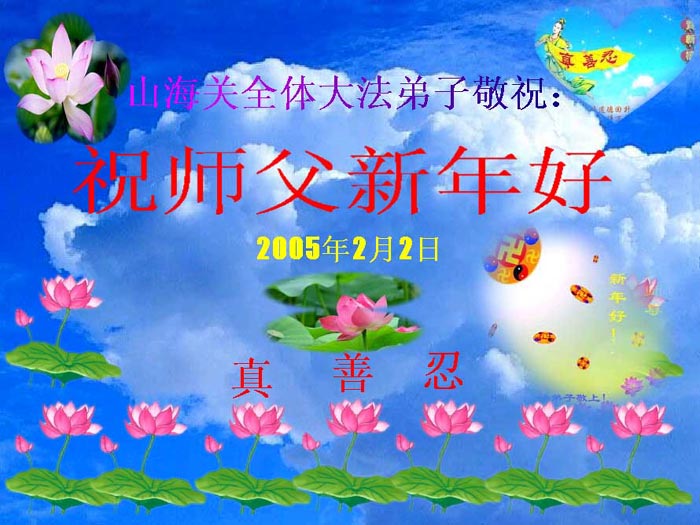 慈悲伟大的师尊,过年好! 在过去的一年,我们的亲朋中,有的默念“法轮大法好!”消除了重病;有的认识了大法,正在成为新的大法学员。新年佳节到来之际,我们代表所有亲朋好友,代表全体德州大法弟子,感谢师尊的慈悲苦度!给师父拜年,合十! 山东省德州市大法弟子 2005年2月4日 深圳大法弟子恭祝师尊新年愉快