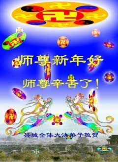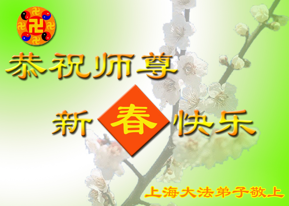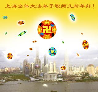 恭祝师父新年快乐! 我们深深的感谢师尊的慈悲,让我们有这万古不遇的修炼机缘,且成为正法时期的大法弟子。 请师父放心:师父不愿落下任何一个弟子,我们也一定会对得起正法时期大法弟子的称号,做好各自该做的,形成坚不可摧的正法整体,决不叫师父失望。  上海大法弟子恭祝师尊新年快乐!