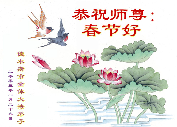 在农历新年到来之际,我们佳木斯全体大法弟子向慈悲、伟大的师尊拜年,并致以最崇高的敬意:师父,过年好!您辛苦了!弟子们想念您!期盼着与您堂堂正正相见的那一天。 同时也祝愿全世界大法弟子新年快乐!在新的一年里,让我们全世界大法弟子更加坚定实修,互相圆容,形成一个金刚不破的整体,做好师父要求的三件事,勇猛精進,走好正法最后的路,共同迎接法正人间的到来。 佳木斯市全体大法弟子 2005年1月29日 佳木斯市大法弟子恭祝师尊新年快乐!