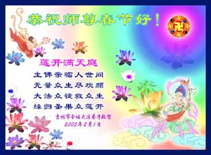 尊敬的师父:您好! 值此新年佳节之际,我们更加想念您,双手合十给师父拜年,恭祝师尊新年愉快。 河北省平山县全体大法弟子 2005年2月4日 昆明及云南全体大法弟子向师父拜年
