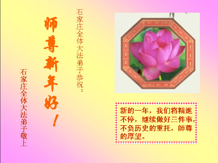 在新的一年里我要听师父的话,做好三件事,不辜负师父的慈悲苦度,更加勇猛精進,圆满完成救度众生的使命。 2005年1月27日 全体石家庄大法弟子向慈悲伟大的师尊拜年