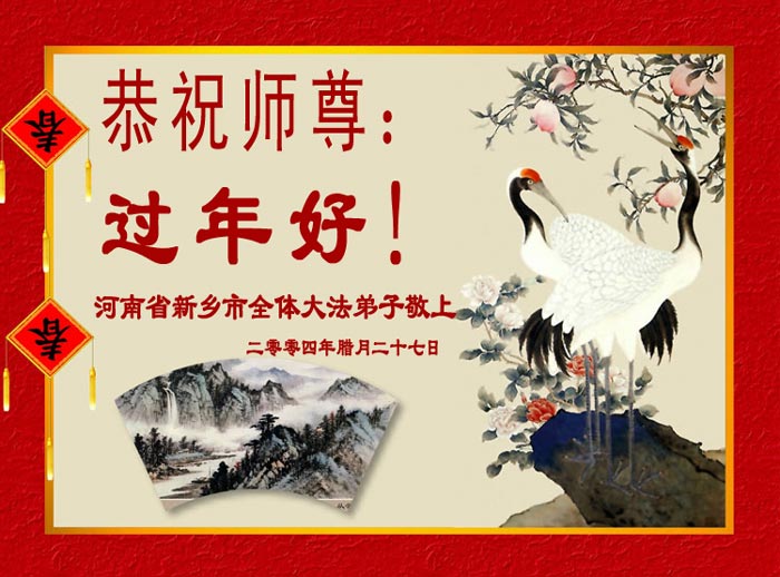 慈悲伟大的师尊:新年好! 我们跟随师尊走过了五年的风雨历程,我们越来越感到师尊的慈悲与伟大,越来越感到救度众生的紧迫性,越来越感到修炼的严肃性。师父对我们的慈悲苦度我们无以言表,我们只有紧跟师父正法進程,做好正法时期大法弟子应该做好的三件事,救度更多的众生,以报师恩。 河北省深泽县全体大法弟子合十同拜 2005年2月4日 河北省新乐市全体大法弟子恭祝师尊新年快乐