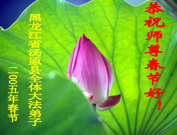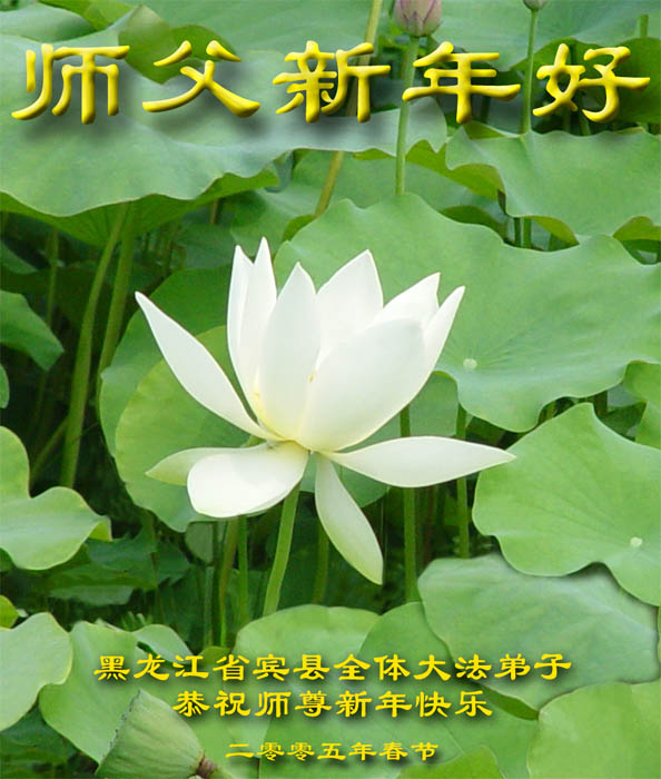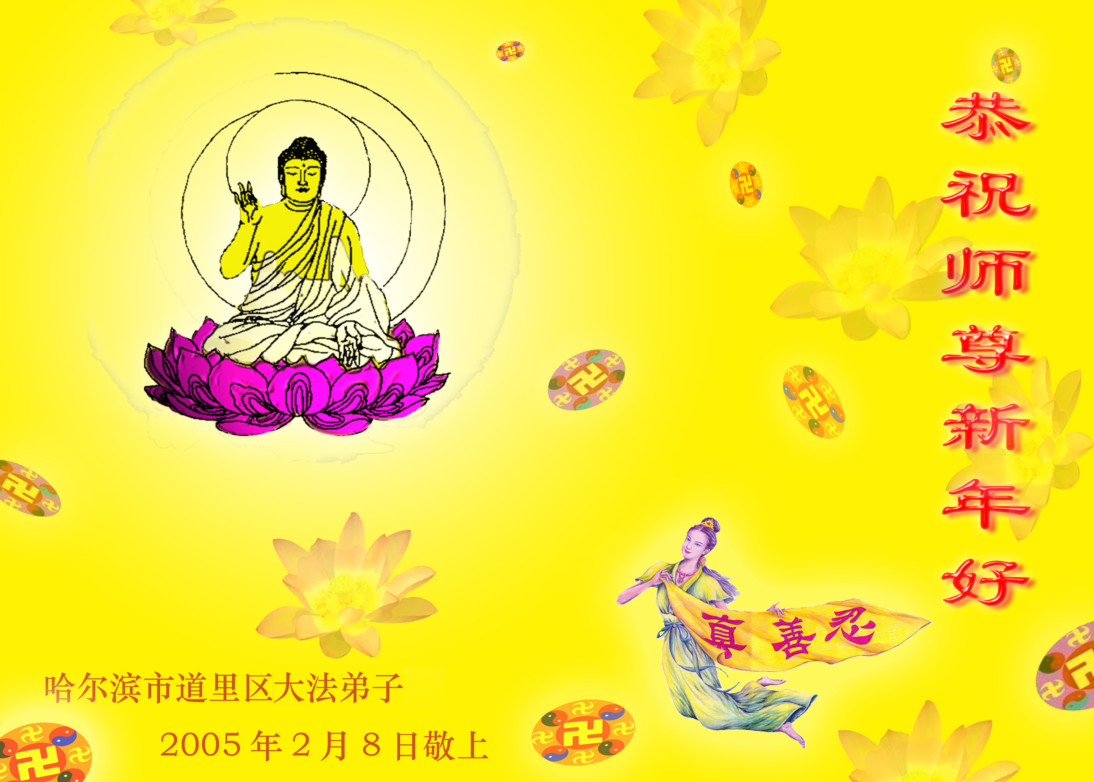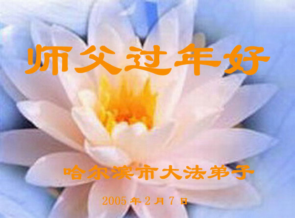在师尊的呵护下走过的这五年里,我们无时无刻不思念慈悲苦度我们的师父,正因为伟大的师尊给了我们力量和信心,我们才能够坚定的走了过来。 值此新春佳节来临之际,我们倍加思念时刻呵护我们的恩师,也下定更大的决心做好师尊要求的三件事,圆满的走好走正剩下的正法之路,请师尊放心! 黑龙江省汤原县全体大法弟子 2005年2月5日 哈尔滨市大法弟子给慈悲伟大的师尊拜年