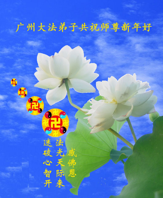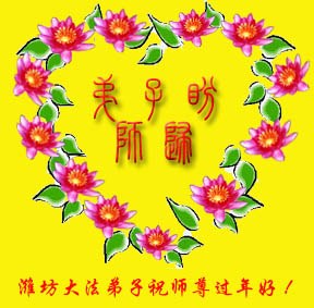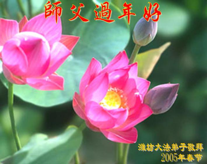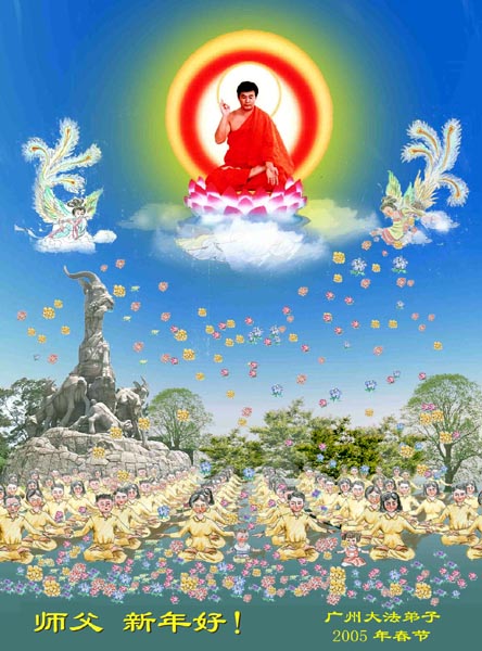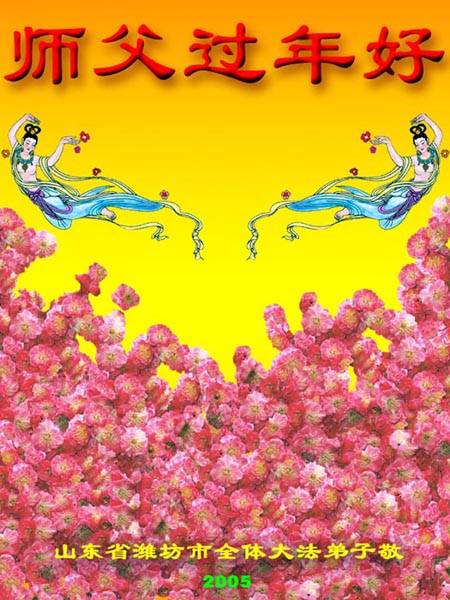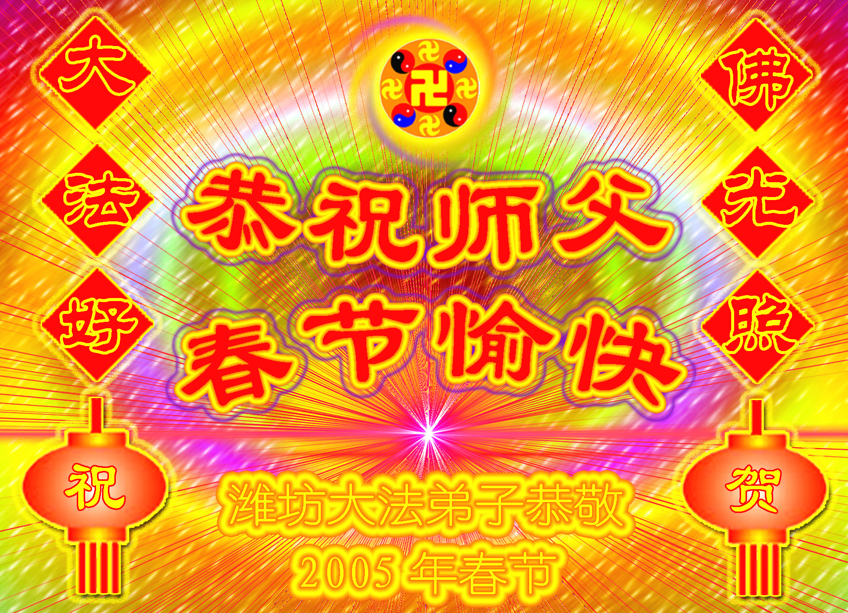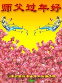 敬爱的师父:您好,您辛苦了,在新年到来之际,弟子们更加想念师父,我们山东潍坊全体大法弟子给您拜年了!  在五年多的风风雨雨中,在敬爱的师父的慈悲呵护下,我们山东潍坊大法弟子坚定的跟着师父走在正法的路上,我们会更加努力的做好三件事,救度众生,不辜负师父的教诲和众生的期望,圆满完成助师正法的神圣使命。 随师正法 沧桑岁月几冬雪 法徒蒙难劫 证实大法心如铁 紧随师 历尽苦难救众生 正念正行 灭尽邪恶 圆满归新宇 众神谢师恩 山东潍坊大法弟子 二○○五年农历新年 广州全体大法弟子向师尊拜年