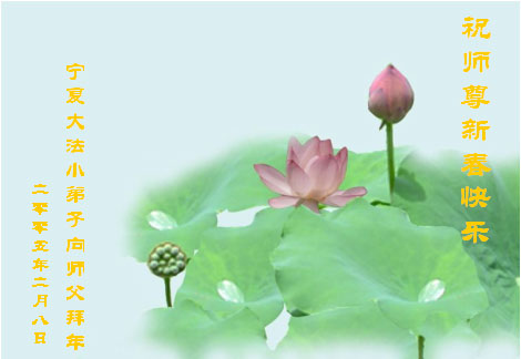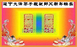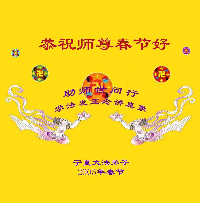 每逢佳节倍思亲。在新春佳节来临之际,让我们双手合十,给慈悲伟大的师尊拜年:您辛苦了!弟子们好想念您!同时我代表那些没有条件上网、而又非常想在新年时向师尊问好的大法弟子,祝师尊新年好!请师尊放心,我们在这正法的最后时刻一定会“坚修大法紧随师”,走好证实法的每一步。 黑龙江庆安全体大法弟子 2005年2月6日 宁夏全体大法弟子恭祝师尊新年快乐