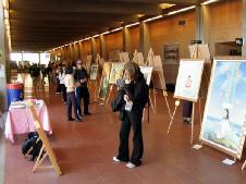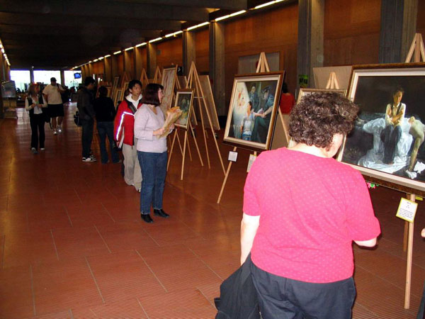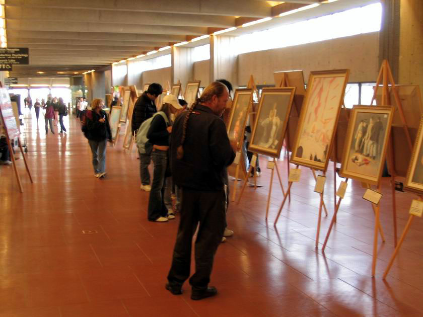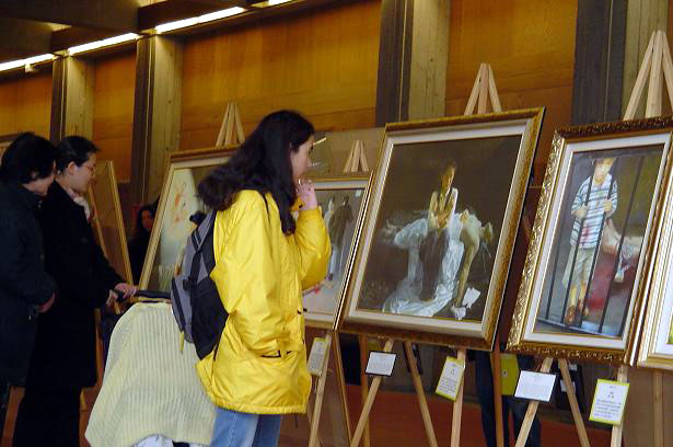 【明慧网2005年3月20日】在加拿大西门菲莎大学(SFU)本拿比山顶灰色格调的教学楼中,法轮功学员艺术家创作的40幅绘画作品的色彩和意境使其略带沉闷的气氛一下明亮了起来。 观众被画展震撼法轮功学员以前在SFU也办过类似的图片艺术展或其他讲真象活动,但这一次,观众的数量和反响都是空前的。一个个艺术化的真实故事场景带来的直接视觉冲击,在画家笔下描述的法轮功学员高贵的品行,画家自身的艺术修养以及画中的内涵所表现出的美好和残暴的强烈对比,使观众的内心深处产生了强烈的震撼和共鸣。 观众感动 留言感人 在观众的留言簿上,写满了这样的话语: “你们的画很感人。我希望有一天中国能允许人们实践所有和平的信仰。” “这些画把我带到了历史上基督徒也遭遇迫害的时候,并且他们现在在世界的其他地方仍然还在遭受着迫害。” “这些画太感人了,当我读这些说明和看到这些人被迫害,我掉泪了。这些画很有启发性和震撼人心。谢谢你们。” “这些画真的表现了恐怖的酷刑和法轮功学员面对巨难的那种强大的内在力量。” “这是在呼唤所有的人,不论你有什么背景和什么宗教信仰,即如果反人类的罪行发生了,我们有责任站出来反对这样的酷刑迫害。” “与灵魂对话的非常有力的艺术” “我震惊了” “很有力” “伟大的艺术” “在遭受磨难时,仍能面对生活,打动人心。” “看到人可以这样虐待别人,感到很悲哀。” “我不能相信这样的事正在发生,为制止这场残暴的虐待,我给予法轮功学员我所有的同情。这些应该结束了,太残忍了!” “宗教信仰迫害一直被恐怖政府和世界上的极端组织作为一种统治手段,我希望人类对自由、知识和内心平和的渴望最终使所有的这些苦难结束,毕竟,这是我们从古到今的向往。” 积极的反响 深刻的理解 有一位SFU的老师被画展所感动,当即邀请一位法轮功学员到他的课堂上向37位研究生介绍画展和法轮功在中国遭受的迫害。这位学员对研究生们说:法轮功是真正的科学。愈来愈多的科学家开始研究修炼和身心健康的关系。美国德州大学的免疫学专家封莉莉教授等采用现代分子生物学技术发现修炼法轮功可以增强免疫力,学生们对此非常感兴趣。