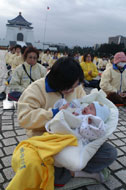 法轮大法,又称法轮功,1992年5月由李洪志先生在中国传出。从1992年5月至1999年7月的七年间,据中国公安内部调查,大陆炼法轮功的人数达到7000万至1亿。1998年11月24日,上海电视台报导法轮功已传遍欧、美、澳、亚四大洲,在上海及世界其它国家广受欢迎的情况,称全世界已有一亿人在炼法轮功。现在法轮大法已洪传世界六十多个国家,有上亿人修炼,并获得世界各国政府、机构的褒奖一千多项。 一对郑氏夫妇先生因身患重病至中国想寻找名医,但友人推荐说学炼法轮功更好,于是他们跟了李洪志先生两个学习班后,身体日渐恢复健康,于1995年正式介绍给台湾民众。郑先生身体奇迹般的改善,渐渐口耳相传,人们开始学炼起来。至今,台湾已有一千多个炼功点,约有50万的人修炼法轮功。 养生气功在台湾一直非常盛行,人们为了强身健体而学练各种功法。清晨的公园里,缓、慢、圆的法轮功动作,及第五套的静功打坐,与嘈杂的人们和剧烈的运动形成了强烈的对比。台湾的法轮功修炼人数急剧增加是在1999年4月25日中南海法轮功学员和平上访事件后,引起国际媒体的关注,在台湾的电视与报章也争相报导,因而修炼人数顿时成倍数增加。 Flaminia在纽约除了了解到中共江氏集团镇压法轮功的血腥暴力,全球诉江案是二次世界大战后目前最大的一个国际人权案。同时,她也非常关心营救被迫害致死的法轮功学员的遗孤行动,呼吁更多善良的人们伸出援手帮助营救这些孩子们。   2005.3.19台湾中正纪念堂广场法轮功晨炼中,一位母亲和她的婴儿 |   大陆法轮功学员王丽萱和年仅8个月的儿子孟昊在迫害中失去生命 |