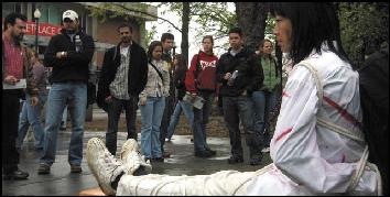 【明慧网2005年4月1日】(明慧记者张颖编译报导)为了唤起学生们关注发生在中国的迫害,法轮功学员在加州州立大学演示了他们在中国所遭受的残酷虐待和酷刑。许多路过酷刑展的学生被演示的酷刑所震惊。